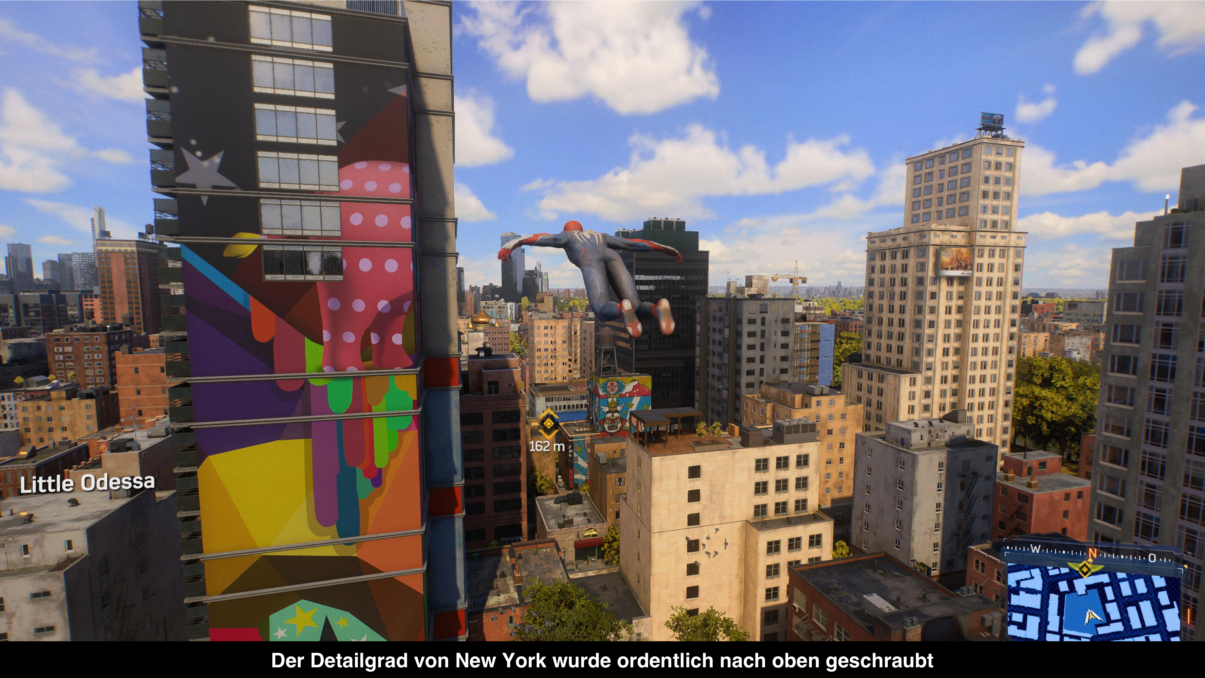 In Sachen Gameplay hat Insomniac die ein oder andere Änderung durchgeführt. Am auffälligsten sind dabei die neuen Web-Wings, die das Traversal durch die Stadt enorm verbessern. Wer kennt es nicht aus dem Vorgänger? Man schwingt voll Freude durch die Stadt, aber plötzlich kommt ein Gebiet mit niedrigeren Häusern oder gar nur Bäumen und man verliert das Momentum. Das Problem ist nun Geschichte, denn mit den Web-Wings könnt ihr nun durch die Luft gleiten und euer Momentum aufrechterhalten. Dank zahlreicher Windtunnel kann man Teile der Stadt sogar in wahnsinniger Geschwindigkeit durchqueren. Neu ist auch der Umgang mit den Gadgets im Spiel. Das “Waffenrad” aus dem Vorgänger ist Geschichte. Stattdessen kann man vier Gadgets auf die Aktionstasten legen, die dann in Kombination mit R1 genutzt werden können. Das ist simpler und unterbricht weniger den Spielfluss. Zudem kann man mit L1 und den Aktionstasten diverse besondere Fähigkeiten ausführen. Ansonsten hat sich am generellen Kampfsystem wenig verändert und die grundlegenden Combos sind die gleichen. Einzige Neuerung ist das Parieren von Angriffen. Wer im richtigen Moment L1 drückt, kann einen Angriff parieren und so direkt zum Gegenangriff übergehen. Manche Angriffe lassen sich neuerdings nur durch Parieren abwehren. Leider ist das rote Symbol recht ähnlich dem normalen roten Symbol zum Ausweichen und in der Eile des Gefechts kann man das mal übersehen. Etwas mehr farbliche Abgrenzung wäre hilfreich gewesen.