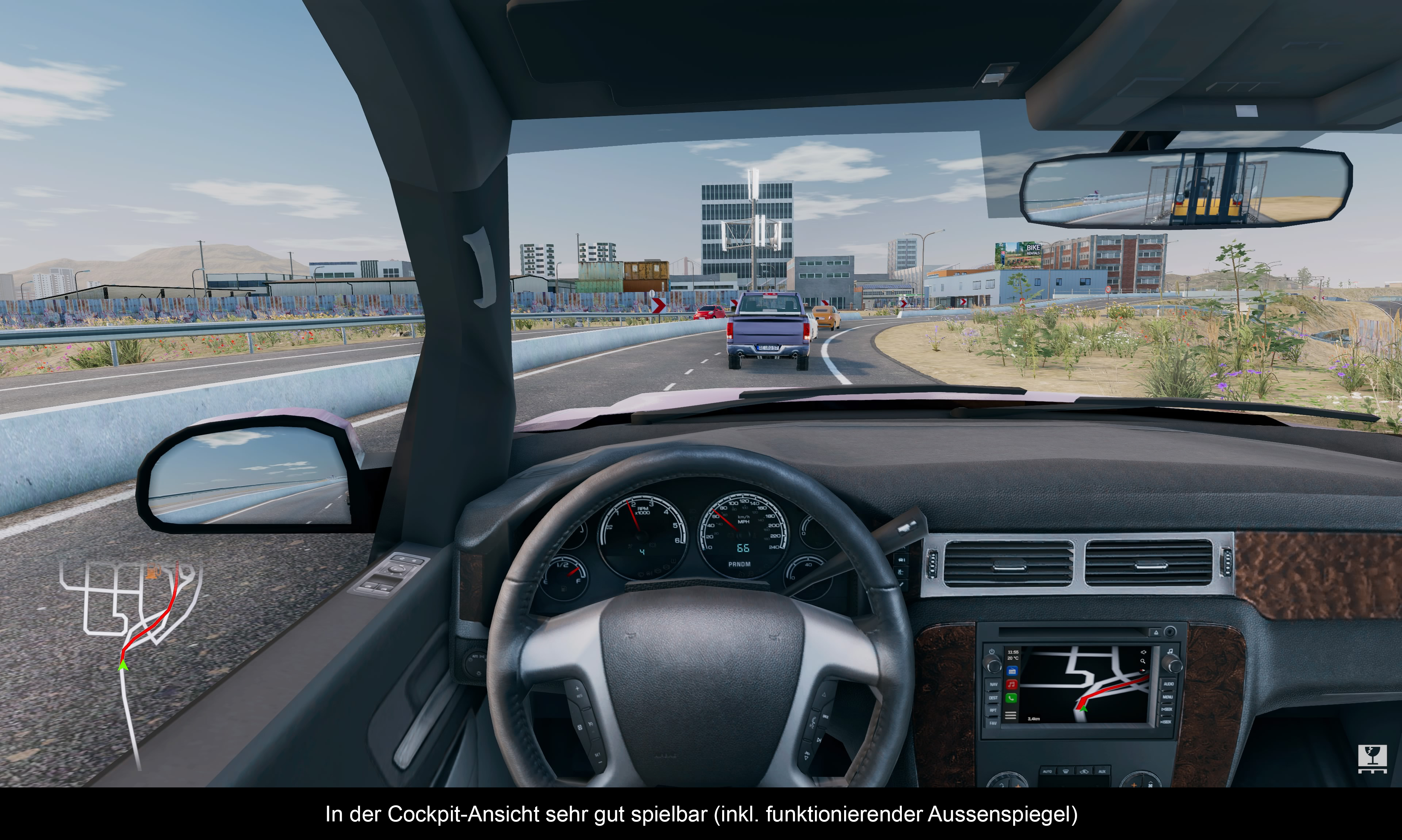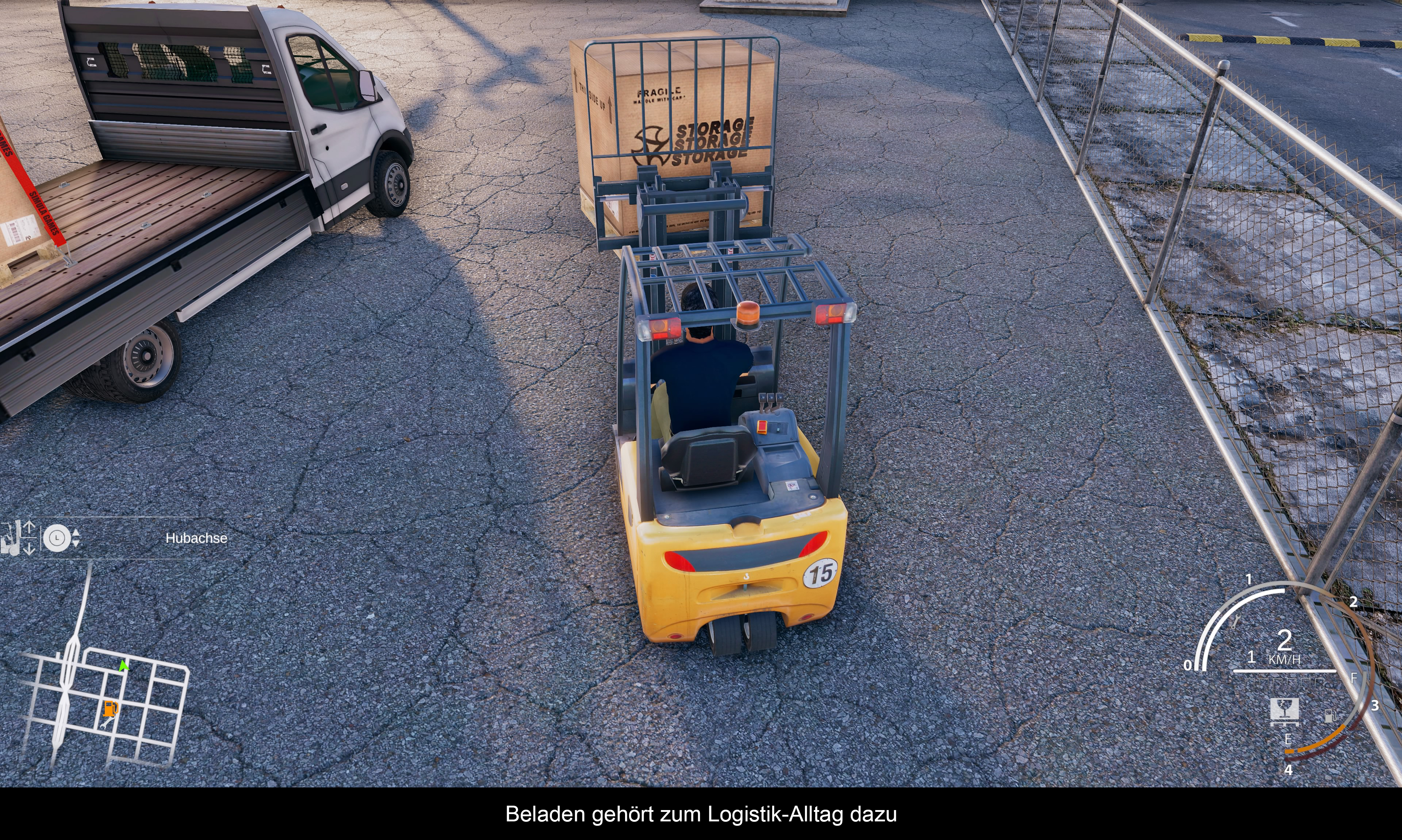 Das Spiel bezeichnet sich als Simulation (das Wort ist ja sogar im Namen enthalten), also erwartet man im Gegenzug auch Ansätze davon. Okay, die Physik der Fahrzeuge ist gelungen – nicht übertrieben, aber realistisch und unterschiedlich genug. Schwere LKWs fahren sich anders als ein sportlicher PKW. Auch die Transporter reagieren unterschiedlich auf die Eingaben des Spielers. Die Anhänger-Physik fällt ebenso authentisch aus. Besonders wenn man damit rückwärts einparken will, kann man Parallelen zur Realität ziehen. Überrascht war ich, wie man mit der Handbremse bei den PKWs richtige (kontrollierte) Drifts hinlegen kann. Auch bemerkenswert: Ein bulliger Ami Pick-Up zieht einen Anhänger deutlich straffer den Berg hoch, als ein untermotorisierter Kangoo. Die Baumaschinen und Gabelstapler sorgen für weitere Abwechslung. Am Ende geht die Steuerung leicht von der Hand, ohne unrealistisch zu wirken. Zudem bietet die offene Spielwelt einen dynamischen Tag und Nacht-Wechsel, Verkehrszeichen, Tankstellen und natürlich Blitzer. Die Cockpits der Fahrzeuge sind funktional, wie auch der realistische Spritverbrauch und das rudimentäre Schadensmodell. Was jedoch gar nicht geht, ist die KI der CPU Fahrer. Die kennen schlichtweg keine Verkehrsregeln / -zeichen und brettern dem Spieler ungebremst in die Karre. Auch andere Simulationsaspekte sind nicht so recht zu Ende gedacht: Autobahnauffahrten verfügen über keine separate Einfädelspur, Ortseingangsschilder sucht man vergebens, Straßen sind mitunter zu schmal und Kurven zu eng (was mit einem riesigen 40 Tonner schon zur Herausforderung wird) und die Polizei lässt sich nur als Deko-Artikel in Baustellen blicken. Wettereffekte werden zwar in einem Ladebildschirm in Aussicht gestellt (Regen), existieren im Spiel aber nicht.