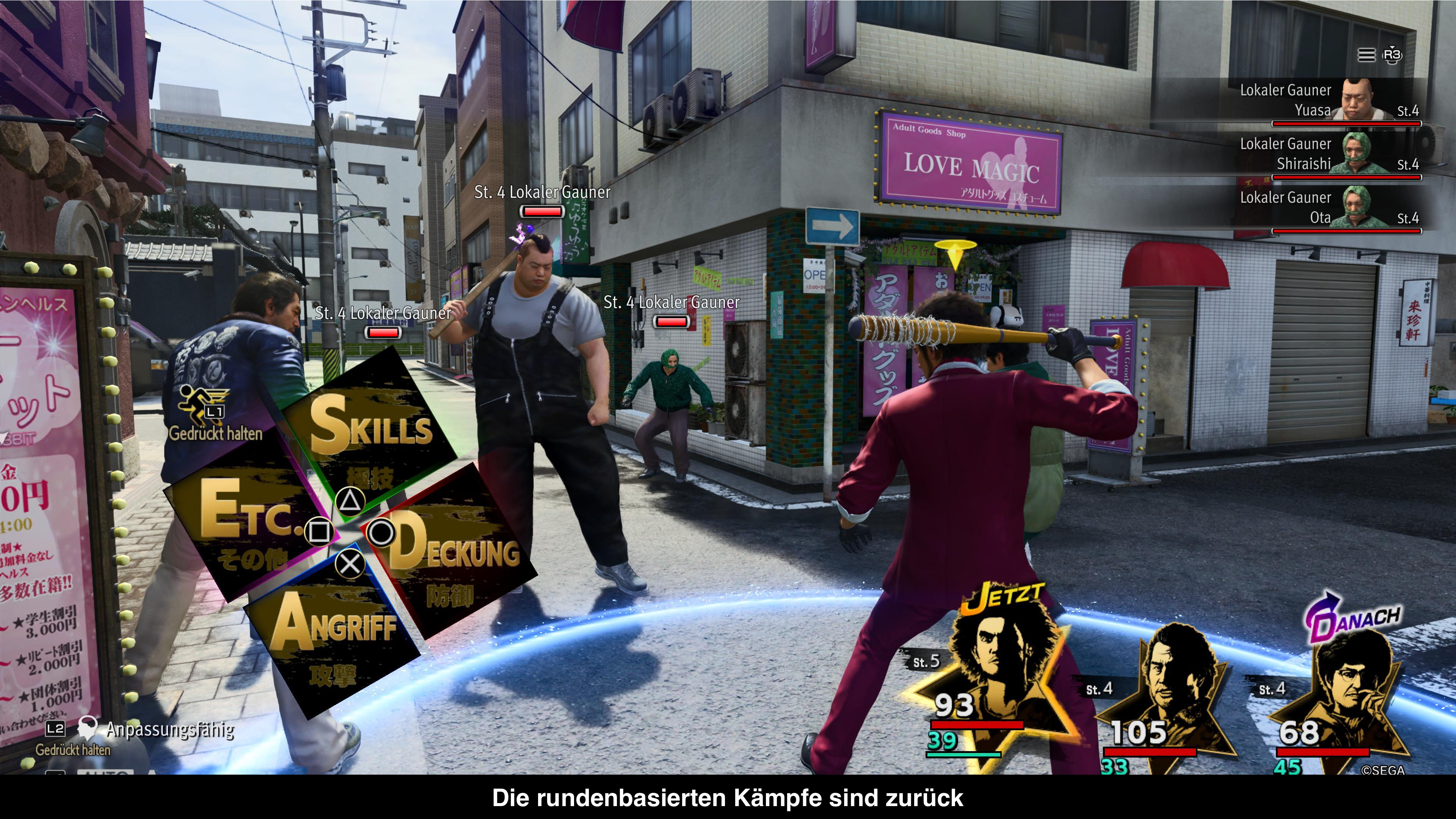 Wie schon Yakuza: Like a Dragon bietet Infinite Wealth ein rundenbasiertes Kampfsystem an, welches aber um ein paar kleine Punkte verbessert wurde. Beispielsweise kann man sich nun in einem gewissen Radius frei bewegen, wenn man an der Reihe ist, um seinen nächsten Angriff zu planen. Denn die eigene Positionierung und die seiner Mitstreiter ist wichtig, weil sich so Kombo-Angriffe oder Umgebungsangriffe ausführen lassen. Leider gibt es weiterhin ein paar kleinere Kritikpunkte, wie z.B. dass man sich eigentlich nicht viel Zeit lassen kann bei der Planung, obwohl das Kampfsystem rundenbasiert ist. Denn die Gegner bewegen sich auch fast konstant, was dazu führt, dass eigene Pläne, vor allem bei Bereichsangriffen, gerne mal durchkreuzt werden. Ansonsten dürften sich Kenner des Vorgängers wieder sofort wie zuhause fühlen und natürlich kann man über das Jobsystem neue Skills freischalten, seine Waffen upgraden oder seine Zeit in Dungeons verbringen, die Erfahrung und Geld bringen. Anders als beim Vorgänger muss man aber nicht grinden und kommt relativ gut durch, wenn man einfach so spielt, wie man möchte.