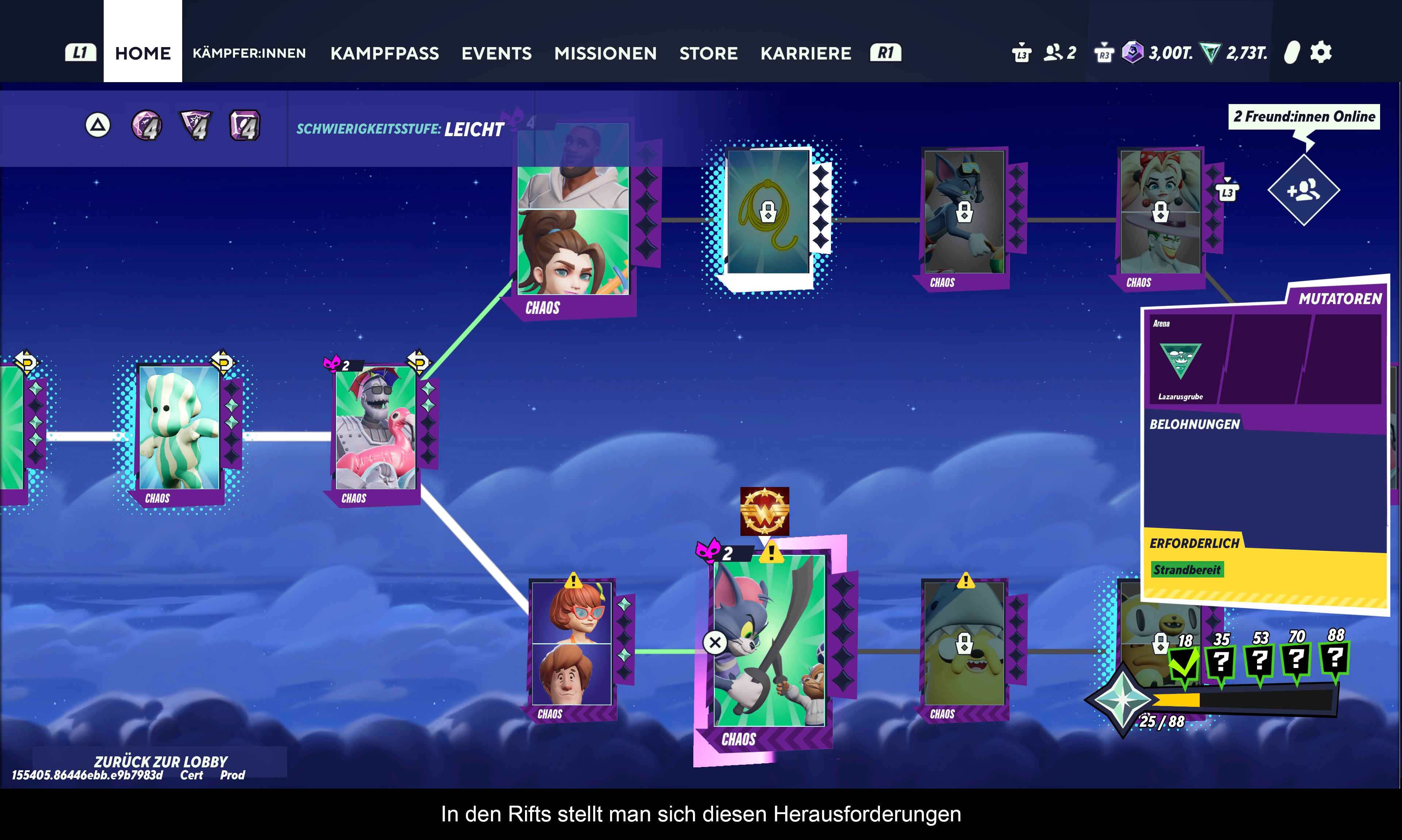 Noch immer ist vieles wie in der Beta, darum gehe ich hier nicht zu sehr auf Details ein. „MultiVersus“ bleibt ein Maskottchen Prügler mit der Lizenz von Warner Brothers, dass bedeutet das vor allem mit Looney Tunes und DC Charakteren zu rechnen ist. Überraschend war dagegen, dass Jason aus Freitag der 13 und Agent Smith aus Matrix in das Spiel Einzug finden. Die Bananenwache aus Adventure Time und der Joker sind ebenfalls neu, passen aber zu den bestehenden Charakteren. Besitzer des Seasonpass kommen sofort in den Genuss von Jason, alle anderen schauen durch die Finger. Die Bananen Wache muss man mit täglichen Aufgaben Freischalten und der Joker und Agent Smith bleiben hinter einer Paywall. Es gibt zwar Mittel und Wege, um diese im Spiel freizuschalten. Aber das wurde bewusst sehr aufwendig gestaltet. Aber bevor wir die Büchse der Micro Transaktionen öffne zu den erfreulicheren Dingen! Es gibt endlich einen Einzelspieler Modus! In diesen sogenannten Rifts gilt es Gegner zu besiegen und kleinere Minispiele zu meistern. Bei den Minispielen müsst ihr einmal mit einem Panzer einen Kristall beschützen, ein anderes Mal Beute aus einem Ballon oder Figur prügeln. Dazwischen gibt es klassische 1vs1 oder 2vs2 Kämpfe mit unterschiedlichen Modifikationen. Eigentlich alles was sich ein Spieler wünscht, nur ist das hier ein Wunsch mit der guten alten Affenpfote. Denn der Fortschritt in diesem System ist mit Gems verbunden. Diese gewähren positive Effekte und machen die Matches leichter. Auch braucht man ein gewisses Gems-Level um sich den höheren Schwierigkeitsgraden zu stellen. Diese Gems lassen sich nur zäh erspielen und um die Ecke lacht schon der Ingame Shop, welcher Kostengünstig diese anpreist! Auch braucht man bei bestimmten Aufgaben gewisse Figuren mit einzigartigen Kostümen. Auch hier schielt der Ingame Store schon wieder um die Ecke. Wäre auch alles verkraftbar, könnte man nicht mit besiegen der Endbosse Agent Smith freischalten. Ein sehr unglückliches Dilemma, welches einen fast schon zum täglichen Grind zwingt. Aber warum sollte man sich das eigentlich antun?