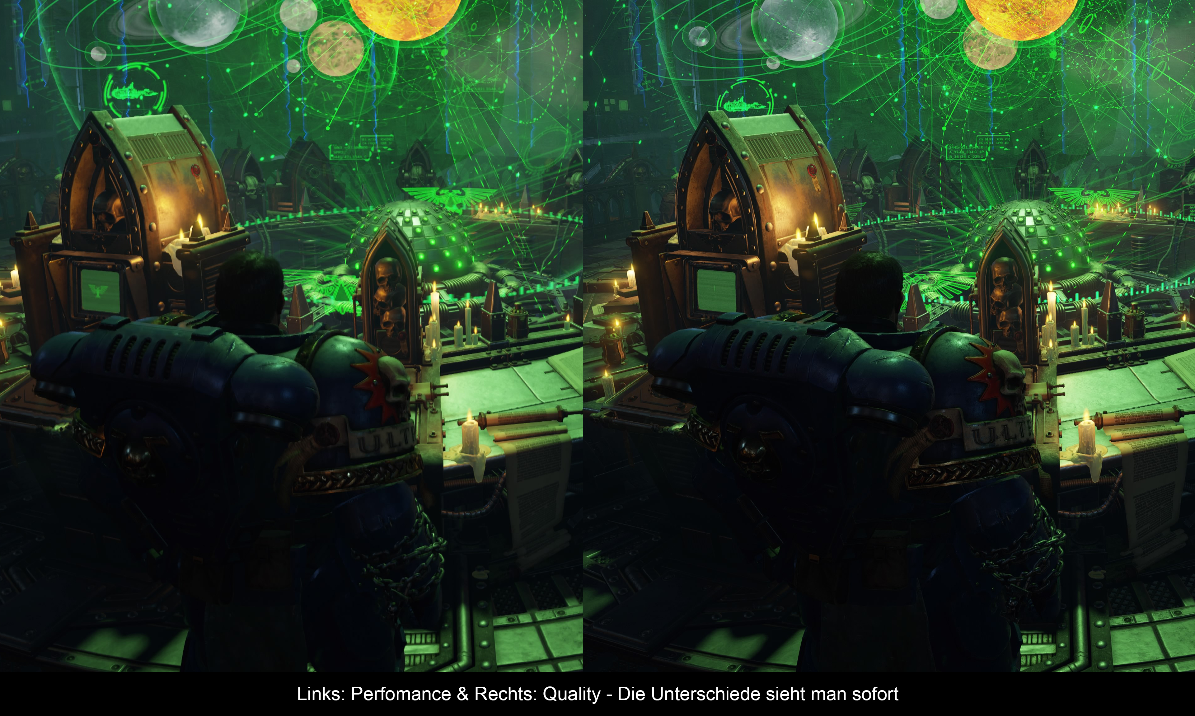 Gekonnt wird die Atmosphäre der Vorlage im Spiel eingefangen. Von Dschungel-Planeten, über militärische Anlagen, Makropolen und Asteroiden – es gibt abwechslungsreiche Kriegsgebiete, die auch über „malerische“ und epische Ausblicke verfügen. Die Schlachtbarke der Ultramarines ächzt ebenso vor Rechtschaffenheit, wie die bestens getroffenen Fahrzeugdesigns der menschlichen Kriegsmaschinerie. Die titelgebenden Space Marines, wurden (wie schon im Vorgänger) sehr gut getroffen und erstrahlen über allen anderen Menschen wie engelsgleiche Titanen. Wenn man etwas am Stil bekritteln könnte, dann vielleicht das die genetisch manipulierten Krieger in ihren Rüstungen etwas zu comichaft aussehen und das nicht zu hundert Prozent zum blutigen Gemetzel passt. Raum für Verbesserungen gibt es bei der grundlegenden Technik. Zur Wahl stehen zwei Anzeigemodi: Performance und Quality. Während die erste Option recht stabile 60fps bietet, muss man im Gegenzug mit einer mickrigen 1080p Auflösung leben. Besonders auf großen Bildschirmen macht sich das bemerkbar, wobei es aber durch den guten Grafikstil und das saubere Bild teilweise gut kaschiert wird. Quality steht für 30fps und 4K Auflösung. Bei großen Gefechten mit vielen Feinden knickt die Framerate hier jedoch immer mal ein, dafür sehen natürlich die Texturen und Effekte deutlich detaillierter aus. Dank eines starken Motion Blurs gewöhnt man sich in kurzer Zeit an die niedrigere Bildwiederholrate. Abschließend kann ich nicht sagen, welcher Modus besser ist – beide haben mit Abstrichen zu leben und einen eindeutigen Sieger gibt es nicht. Apropos: HDR sucht man vergebens, ebenso wie eine ordentliche DualSense-Unterstützung. Lediglich beim Laufen wackeln die Rumble-Motoren im Gleichschritt. Die adaptiven Trigger werden dagegen nicht unterstützt.
