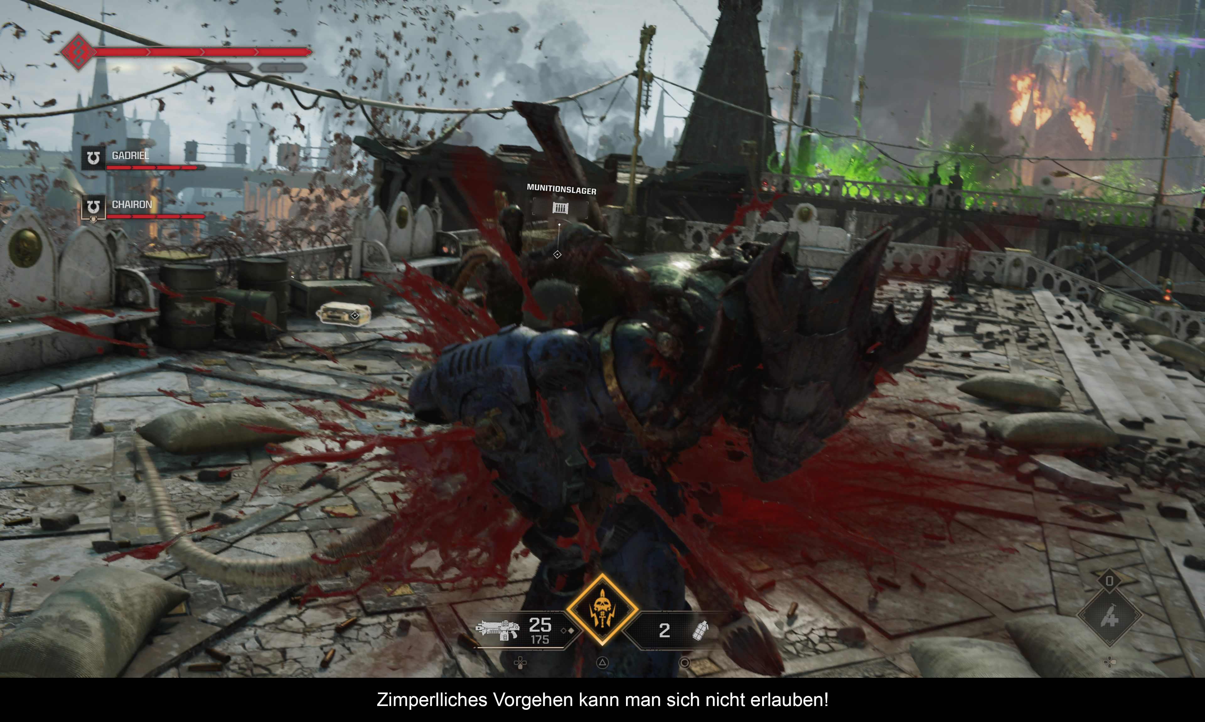 Das Gameplay ist schnell erklärt: Man schlüpft in die Rolle des Ultramarines Titus und macht mit seinen zwei Brüdern alles platt, was sich ihnen in den Weg stellt. Aber Achtung, das Spiel ist kein Cover-Shooter, man muss den Nahkampf suchen! Auch wenn man natürlich über Schusswaffen verfügt (eine primäre und eine sekundäre Waffe), Medikits, sowie Granaten – die Panzerung schmilzt schneller, als einem lieb ist. Bloß gut, dass man bei Spezial-Moves wie den Exekutionen auch Panzerung zurückbekommt. Ausweichen kann man natürlich auch, aber das fühlt sich eher wie behäbiges zur Seite treten an. Für die Bosskämpfe wird es dennoch benötigt und hier macht sich auch eine kleine Schwachstelle im Gameplay bemerkbar: Entweder ich steuere lebendige Panzer, oder aber filigrane Akrobaten. Man kann nicht auf einmal erwarten, dass man graziöse im Sekundentakt durch die Gegend springt und rollt. Dadurch ziehen sich einige Bosskämpfe etwas in die Länge. Für eine seltene Abwechslung sorgen die Einsätze mit Sprungmodulen. Die Spezialfertigkeit von Titus, bei der er in wilder Rage alles um sich herum niedermetzelt und dabei Gesundheit zurückgewinnen kann, wird ebenfalls in aller Regelmäßigkeit aktiviert. Da hier eine Abklingzeit zu beachten ist, sollte man für den Fall der Fälle auch über eine Rettungs-Reliquie verfügen, um dem nahenden Tod dann in der letzten Sekunde noch mal von der Schippe zu springen. Insgesamt fallen die Kämpfe viszeral aus und man Spaß, schon alleine, weil die Gegner nicht in unendlicher Zahl erscheinen. Irgendwann ist immer Schluss.