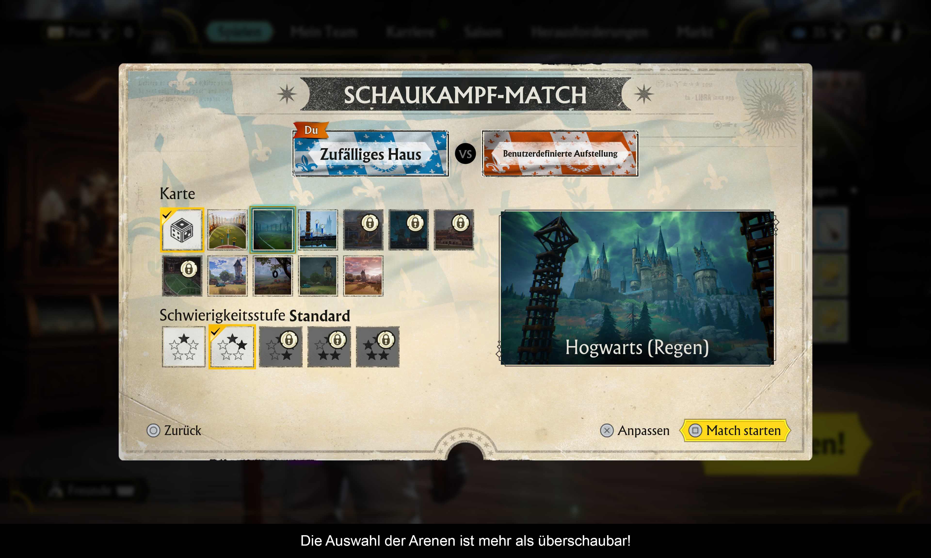 Das Spiel bietet einen robusten Charakter-Editor, um seinen eigenen Spieler zu basteln. Wer will, kann auch aus vorgefertigten Helden wählen. Zudem stehen unzählige Kleidungsstücke, Besen, Zauberstäbe und Siegesanimationen zur Auswahl. Viele dieser Dinge muss man sich aber erst durch Erfüllen von Aufgaben oder durch Levelsteigerungen erspielen. Zudem gilt es noch, verschiedene Attribute bei Spielern und Besen zu verbessern, damit man agiler auf dem Spielfeld ist. Leider verschweigt das Spiel, ob diese Verbesserungen auch im Online-Modus zählen. Da man aber gegen Level 60 Spieler so gut wie keine Chance hat, ist wohl davon auszugehen. Was sofort negativ auffallen wird, ist die Struktur des Shops und wie man Dinge freispielt. Vieles erinnert an bekannt Free 2 Play Systeme, ohne jedoch irgendetwas mit Echtgeld kaufen zu können. Man darf gespannt sein, wann und ob eine richtige Free 2 Play Variante des Spiel noch angekündigt wird.