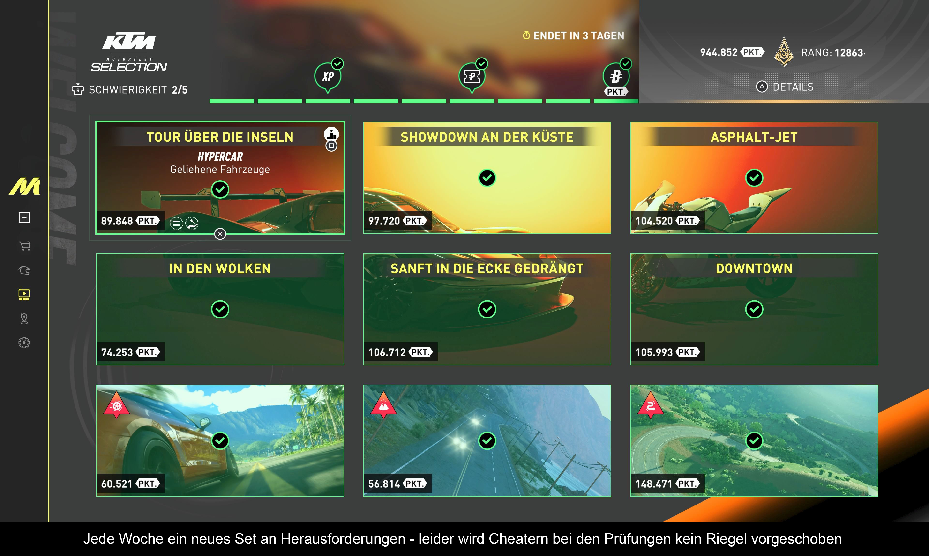 „Motorfest“ ist als Live Service Game angelegt und, das muss man Ubisoft zu Gute halten, ist der Support bislang sehr gut. Jede Woche gibt es eine neue Playlist mit sechs Rennen (bekannte Events aber mit Modifikationen versehen) und drei Herausforderungen. Das alles dreht sich oftmals um bestimmte Automarken, Tuner oder Influencer aus diesem Bereich. Als Belohnungen für einen bestimmten Rang winken Geld, Tuningteile, Legendenpunkte, kosmetische Items und Autos. Allerdings sieht man auch, dass Ubisoft gegen Cheater nichts unternimmt – wie im normalen Spiel sind auch bei den Herausforderungen keine Beschränkungen vorhanden. Findige Spieler meistern so Radarfallen mit Drag-Racing Autos (bis zu 800km/h schnell) oder Slalomabschnitte mit einem wendigen Flugzeug. Deutlich schneller als mit einem normalen Auto, so dass man niemals in diese Punkteregionen vordringen kann, was sich dann natürlich im wöchentlichen Punkte-Ranking bemerkbar macht. Unter fairem Wettbewerb stelle ich mir was Anderes vor. Somit sind diese Herausforderungen bestenfalls ein netter Zeitvertreib, mehr aber nicht. Meistens braucht man übrigens bestimmte Fahrzeuge dafür. Entweder man erspielt sich das Geld (mittlerweile recht einfach), oder aber man ist in einer Crew, denn dort reicht es aus, wenn einer das Auto besitzt. Alle anderen Crew-Mitglieder können das mitnutzen.