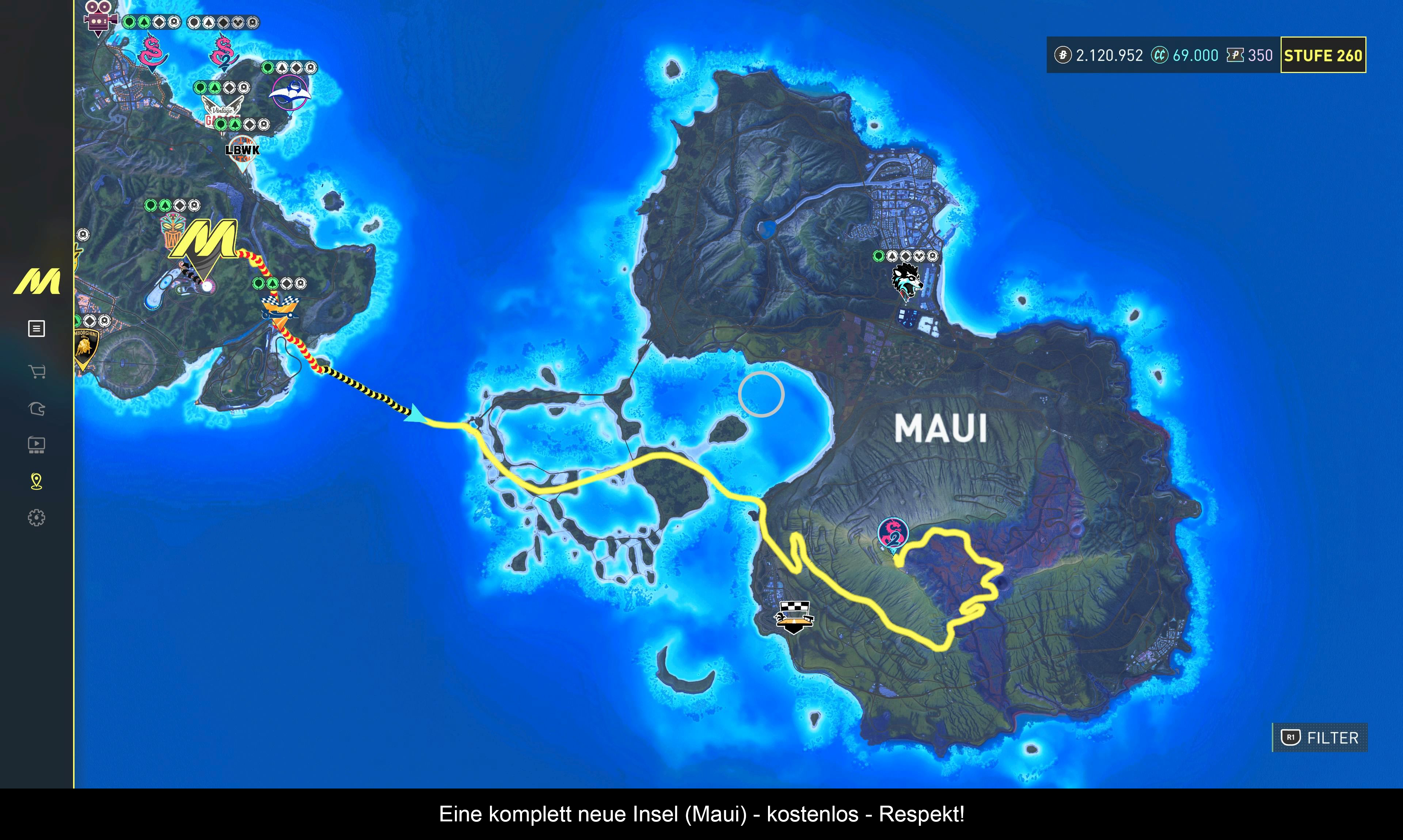 Nach einem Jahr schaltet Ubisoft einen Gang höher und bringt mit einem kostenlosen Update eine ganz neue Insel. Maui gehört auch zu Hawaii und vergrößert die offene Spielwelt um fast das Doppelte! Mit riesigen Brücken und Highways sind die beiden Eilande miteinander verbunden. Ansonsten fällt aber auf, dass auf Maui wesentlich bessere Strecken existieren (okay, nicht in der Realität), aber das sorgt für fetzigere Hochleistungsrennen. Optisch orientiert sich die Landschaft zwar auch an O'ahu, bietet aber genügend distinktive Unterschiede, wie zum Beispiel den Bambus-Wald, oder die Küstenregionen. Auch die städtischen Gebiete haben einen anderen Look und bieten sogar trockene Abwasserkanäle! Ach und dann gibt es da natürlich noch den aktiven Vulkan!