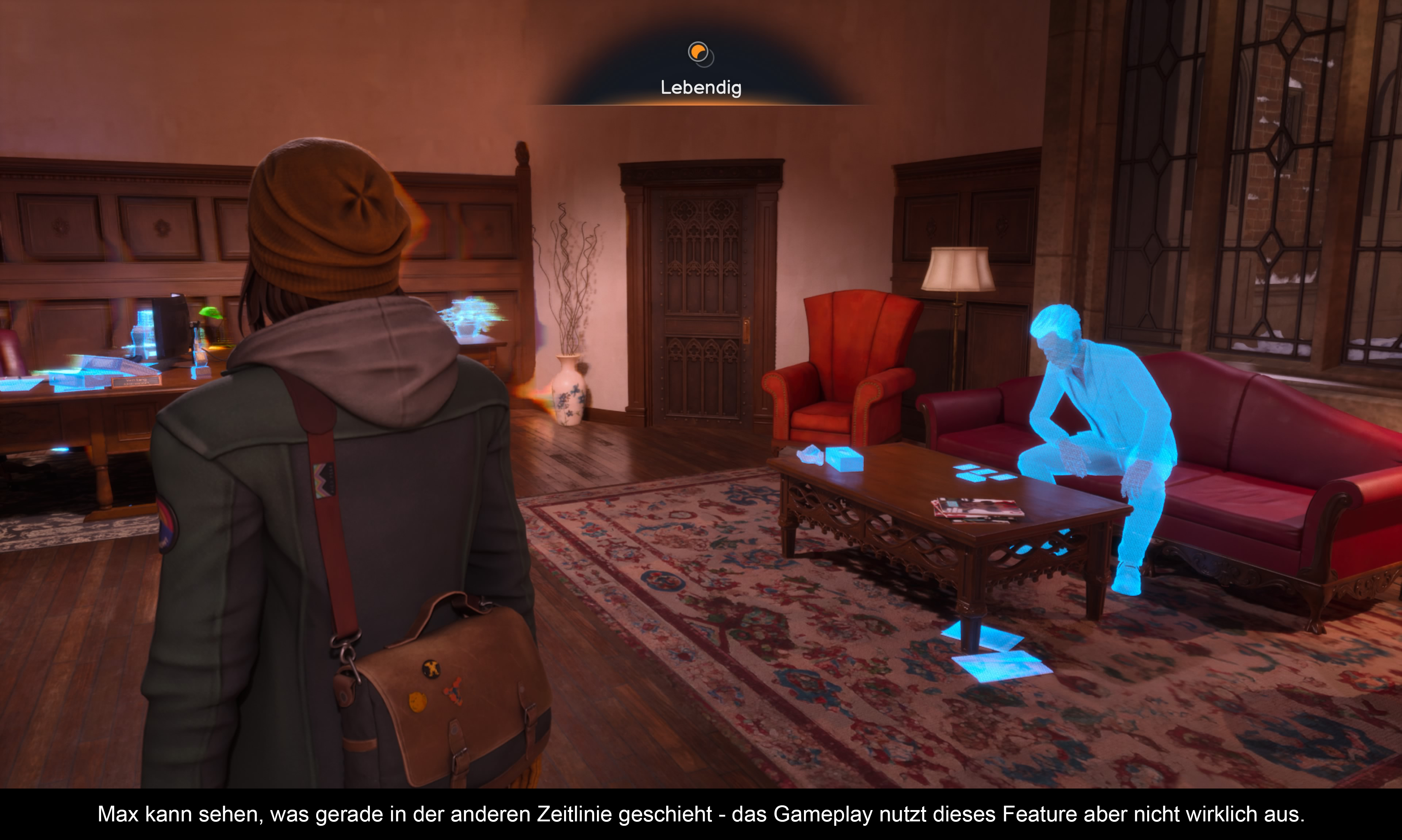Als reinen Walking Simulator würde ich die Reihe nicht betiteln. Es gab schon immer mehr Interaktivität als bei ähnlichen, narrativen, Spielen. Aber richtige Puzzles oder Rätsel sucht man dennoch vergebens. Man wird die ganze Zeit über an die Hand genommen. Wenn man mal wirklich nicht weiterkommt, dann eigentlich nur, weil man irgendein Objekt noch nicht untersucht hat. Bedauerlich, denn durch die parallelen Dimensionen hätte man viele coole Sachen integrieren können. Die Betonung liegt auf „hätte“, denn am Ende lenkt das Spiel den Spieler immer in die richtige Zeitlinie. Dadurch verkommt das Wechselspiel jedoch zu einem reinen Gimmick. Übrigens durchschreitet man diese Zeitlinien an Hand von fixen Portalpunkten, die man an vielen Stellen in der Spielwelt findet. Damit man nicht den Überblick verliert, sieht man aber jederzeit, ob man sich gerade in der „Toten“ oder „Lebend“ Dimension befindet. Es existiert auch ein Tagebuch, welche die letzten Geschehnisse im Spielverlauf zusammenfasst. Ebenso führt Max Protokoll zu allen wichtigen Personen – so dass man sich selbst ein paar Gedanken zu möglichen Motiven machen kann. Obendrauf kommt noch das ganze Social Media Gedöns. Ab der Hälfte des Spiels habe ich das jedoch nicht mehr durchgelesen, es war einfach viel zu viel. Ansonsten kann man Polaroid-Fotos finden und eigene Fotos schießen. Auch wird man mit Trophäen belohnt, wenn man bestimmte Situationen erfolgreich meistert. Platin bekommt man allerdings nur, wenn man das Abenteuer mehrmals durchspielt und ich weiß nicht, ob und wie praktikabel das ist, vor allem nach diesem Ende. Minispiele oder aufgesetzte Schleicheinlagen gibt es dagegen nicht.