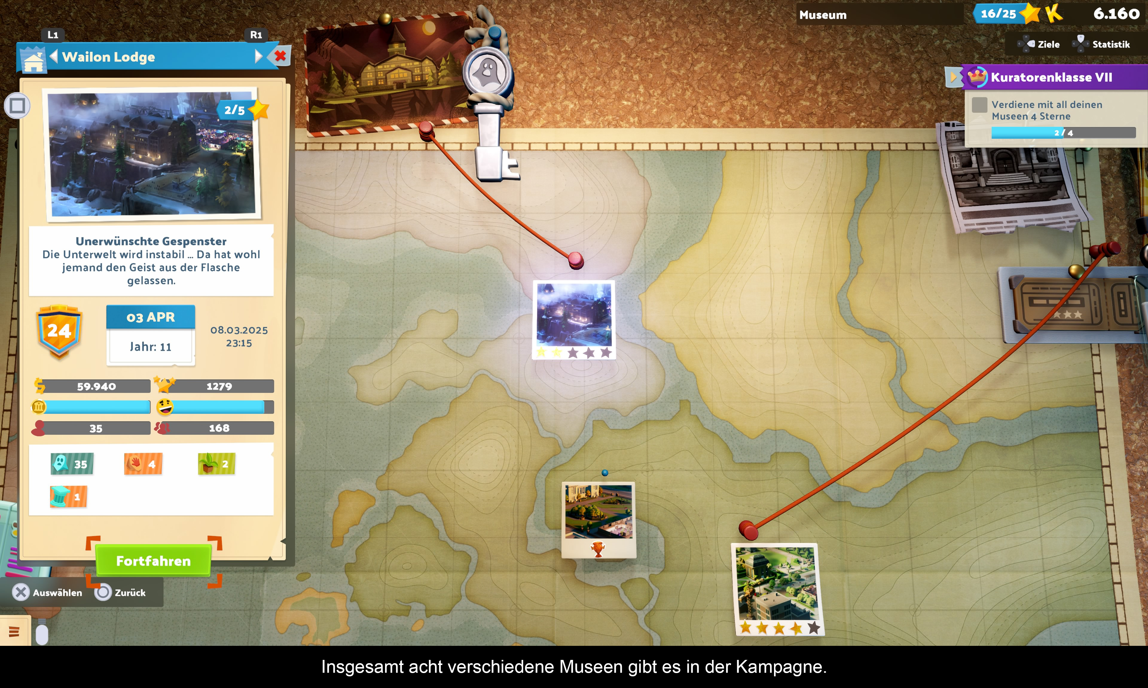 Was die Präsentation betrifft, reiht sich das Spiel nahtlos in die Reihe ein. Bedeutet, dass es abermals kein Grafikbrett ist, aber dank der zahlreichen Exponate konnte man nochmals die Kreativität steigern. Alleine die übernatürlichen Artefakte strotzen vor vielen kleinen Gags, so dass es Lust macht, diese genauer zu betrachten. Was jedoch wirklich zu einem Problem wird, ist die Verlangsamung bei einem voll ausgebauten Museum. Die PS5 kommt, warum auch immer, nicht mit dem Berechnen der zahlreichen Besuchermassen hinterher. Änderungen kann man nur noch vernünftig im Pause-Modus machen, wo das Spiel wieder butterweich läuft. Da kann man nur hoffen, dass dieser Fehler zeitnah behoben wird. Sonst gibt es kaum Negatives zu berichten, da ich in meinen 30 Stunden nur mit einem einzigen Absturz kämpfen musste. Der Rest der technischen Probleme waren Kollisionsabfragen bei der Einrichtung. Nach dem Laden des Spielstands treten diese überraschend häufig auf, lassen sich aber schnell lösen. Akustisch plätschert der Soundtrack ruhig vor sich hin und bleibt vornehmlich im Hintergrund. Die Radiomoderatoren sind dieselben wie bei den Vorgängern, was einerseits gut in die Welt des Two Point Country passt, aber andererseits die gleichen lahmen Gags wie in den Vorgängern gibt. Da wünsche ich mir mehr Abwechslung!