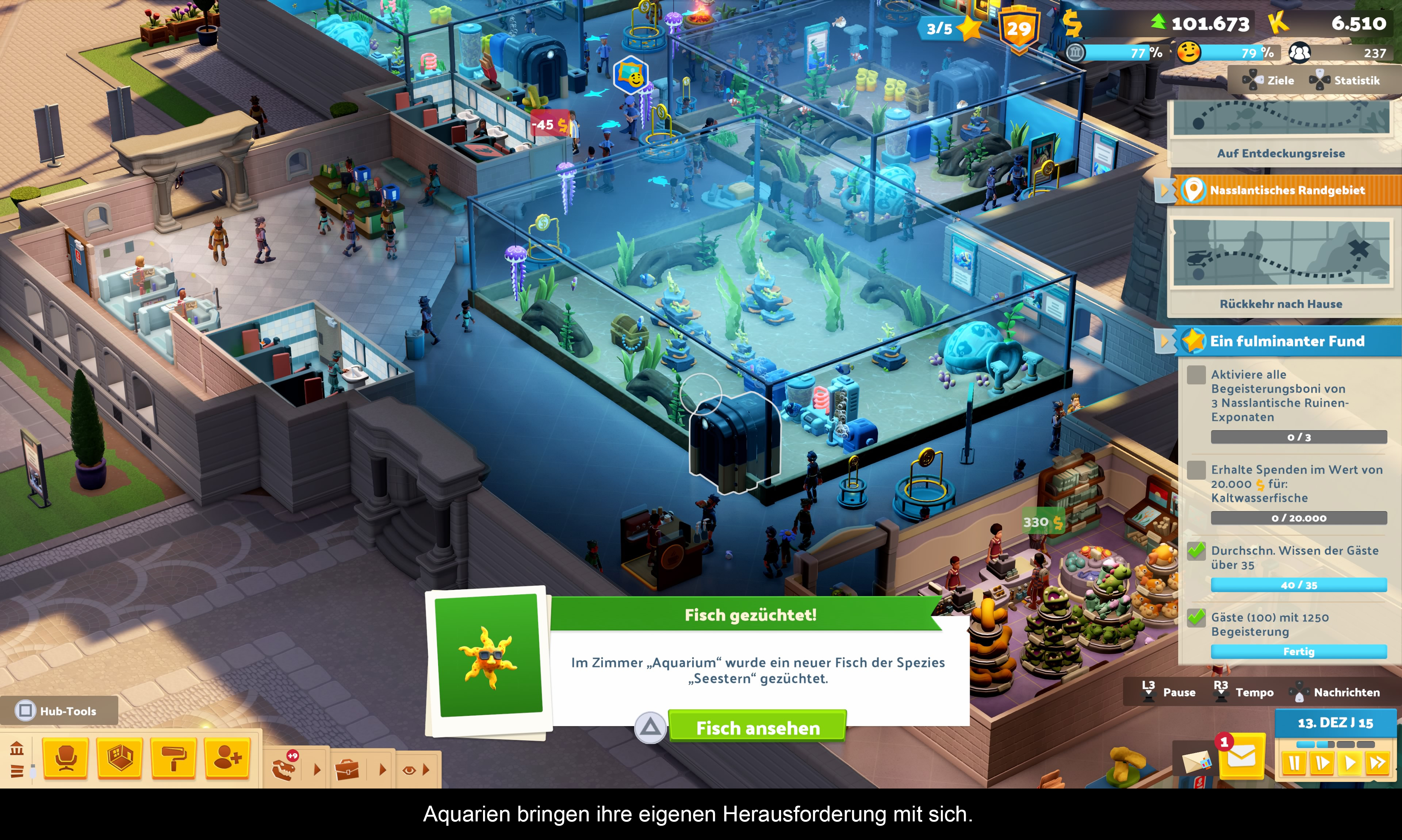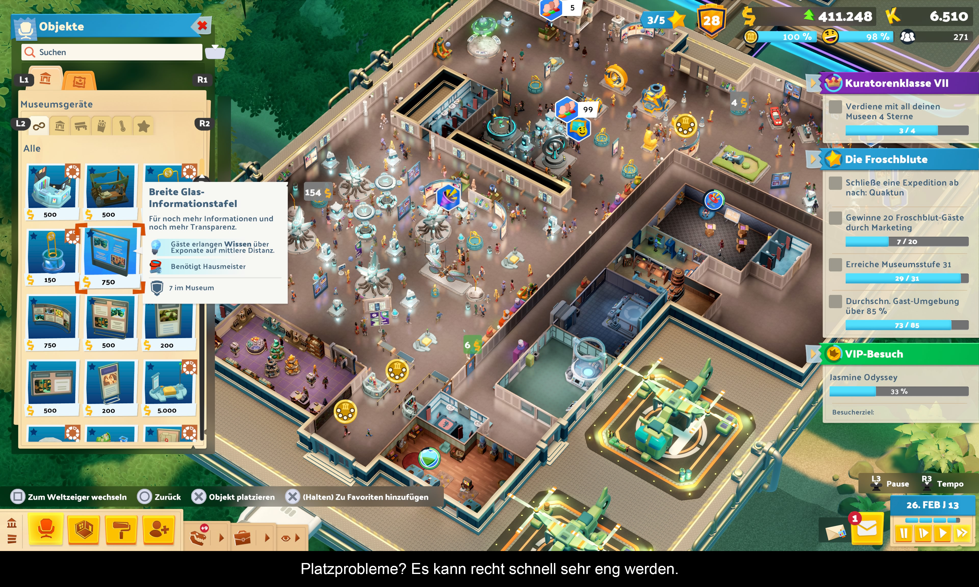 Der Unterschied zu den Vorgängern besteht darin, dass man sich nun nicht mehr raumweise vorarbeitet. Dank den neuen Bauoptionen kann man nun eigene Flügel erstellen und mit den entsprechenden Exponaten schmücken. Das oberste Ziel ist es daher, die Besucher gezielt durch das Museum zu führen, sodass sie möglichst viele dieser Exponate sehen, dabei etwas lernen und dementsprechend eine kleine Spende hinterlassen. Diesen Weg gilt es mit Wissenstafeln, Getränke- und Imbissautomaten zu bestücken. Am Ende sollte ein entsprechender Souvenirshop stehen, wo der Gast nochmals zur Kasse gebeten wird. Ein gut strukturiertes Museum lässt nicht nur Besucher frohlocken, sondern hilft auch dem Personal bei seinen zahlreichen Aufgaben und füllt das Konto.