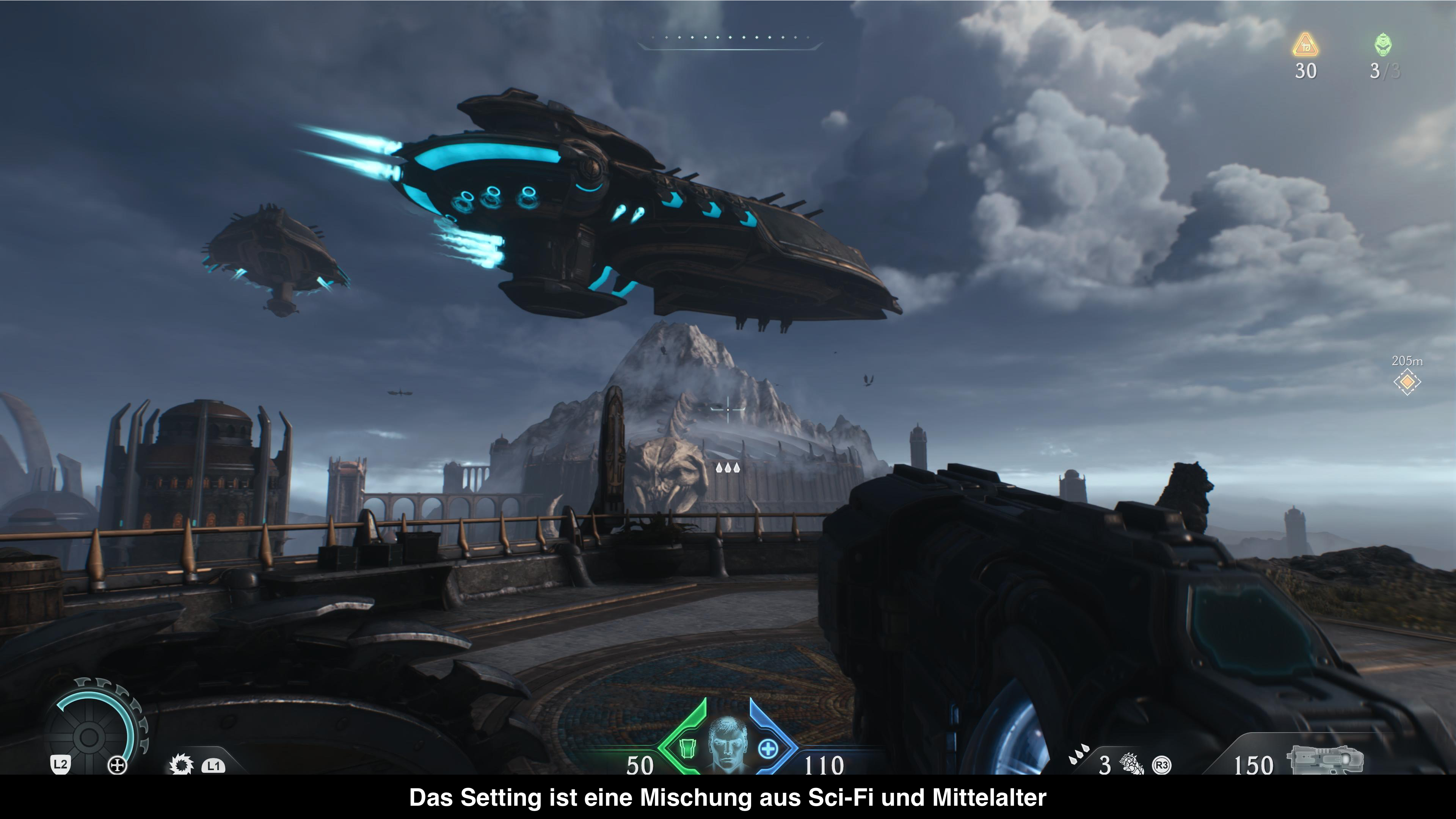 Die Welt von Doom: The Dark Ages ist eine verrückte Mischung aus Sci-Fi und Mittelalter. Ihr verbringt lange Teile des Spiels in gewaltigen Festungen mit beeindruckenden Monumenten, trifft aber gleichzeitig auf Dämonen und Sci-Fi-Kämpfer, die aus Halo stammen könnten. Grafisch wird einiges geboten: Die Areale sind detailliert modelliert, die Beleuchtung ist stimmig, und die Gegner stechen mit ihren mittelalterlichen Rüstungen hervor. Auf der PlayStation 5 Pro läuft das Spiel stabil mit 60 FPS bei 4K-Auflösung. Andere Grafikoptionen sind nicht verfügbar, aber auch nicht notwendig.