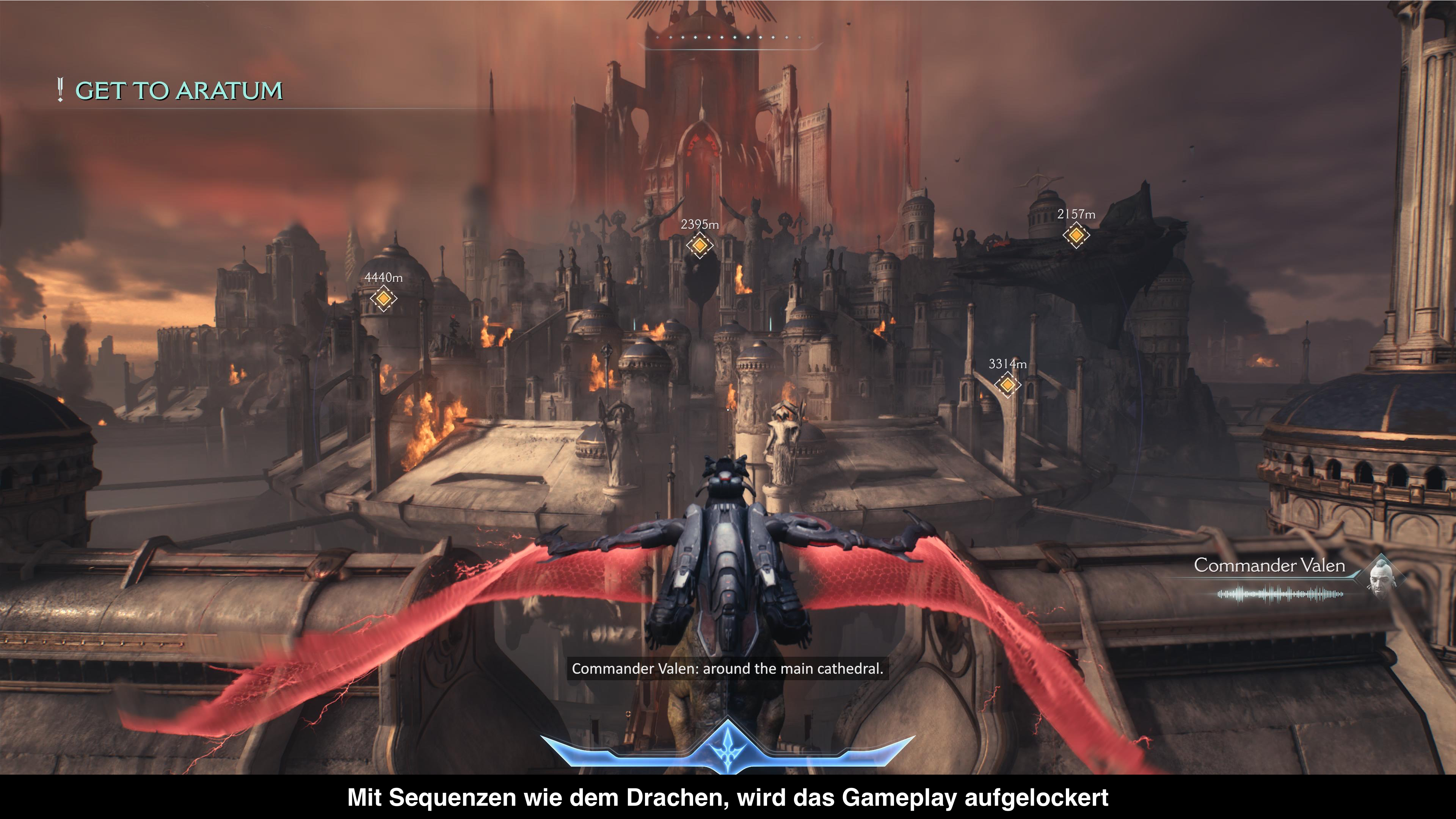 Ein weiteres Highlight sind die größeren Areale, die fast wie offene Welten wirken, in denen ihr euch frei bewegen könnt, um eure Missionsziele zu erfüllen. Zwar gibt es immer wieder etwas zu entdecken, aber selten etwas wirklich Nützliches. Oft findet man nur neue Skins oder Codex-Einträge, während die Ressourcen, die ihr zum Aufleveln benötigt, tatsächlich hilfreich sind. Glücklicherweise sind diese auf der Karte eingezeichnet. Insgesamt sind die größeren Areale ein nettes Feature, doch die offenen Welten tragen nicht wirklich zur Verbesserung des Spiels bei. Es fehlen spannende Geheimnisse, die es zu entdecken gäbe, und sobald ein Gebiet von Gegnern befreit ist, wird das Sammeln der letzten Ressourcen eher zur langweiligen Pflicht. Allerdings sind nicht alle Levels offene Welten – es gibt auch klassischere Abschnitte. Zudem erwarten euch abwechslungsreiche Szenen wie Kämpfe in einem riesigen Titan oder Level, in denen ihr auf einem Drachen durch die Lüfte reiten könnt. Diese wirken jedoch eher wie kleine Spielereien denn als ausgeklügelte Gameplaysysteme.
