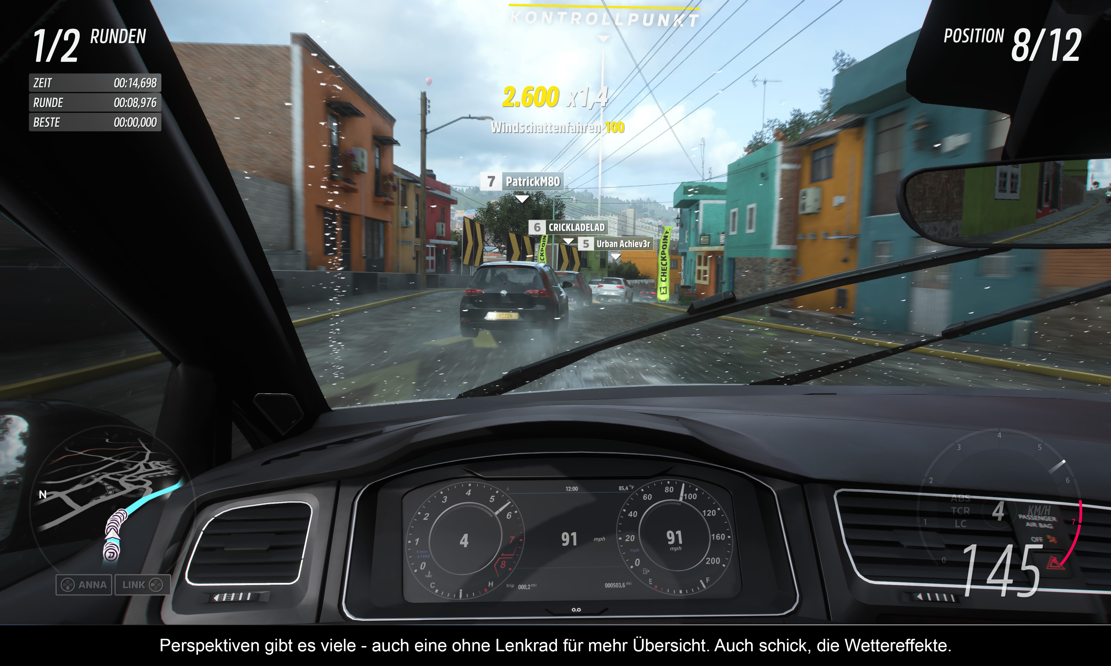 Das allgemeine Gameplay und vor allem das Handling kann man schon fast als perfekt bezeichnen. Die Autos fahren sich alle unterschiedlich, reagieren auf verschiedenen Terrains anders und durch Tuning können viele Aspekte verbessert werden. Die Gegner sind nicht die hellsten, aber dank verschiedener Schwierigkeitsstufen kann man sich die Herausforderung selbst aussuchen. Ob die Drivatare jedoch einen realen Mehrwert bieten, bleibt spekulativ. Auch auf der Stufe „Unschlagbar“ fahren sie nicht schlauer und fähiger. Natürlich muss man nicht gegen den Computer antreten, sondern kann auch unkompliziert mit oder gegen andere menschliche Fahrer Rennen bestreiten. Die Palette ist dabei weit gefasst und reicht von normalen Straßenrennen und Querfeldein-Rallys über Horizon-Arcade-Punkte-Herausforderungen für das Driften und Zerstören bis hin zu verschiedenen Minispielen. Bei „Infiziert“ versucht man beispielsweise, vor Fahrern zu fliehen bzw. als „Zombie“ andere Spieler zu infizieren. Es gibt auch Capture the Flag, Eliminator und Versteckspiel. Abwechslung wird auf jeden Fall geboten, auch weil man jedes Rennen kooperativ spielen kann. Und weil das noch nicht reicht, gibt es auch noch die Seasons, bei denen es wöchentliche Herausforderungen mit besonderen Belohnungen (Autos, Kleidung, Hupen, Wheel Spins usw.) gibt. Neben fahrerischen Herausforderungen (zum Beispiel drei Sprünge in einem Rennen) werden auch multi- und singleplayerorientierte Inhalte geboten. Es gibt Team-Rennen und Mini-Championships, bei denen man in drei Rennen mit vorgeschriebenen Fahrzeuggruppen und Tuning-Obergrenzen teilnimmt. Das ist schon ziemlich anspruchsvoll – zumal auch noch Foto-Herausforderungen und Schatzsuchen bewältigt werden wollen. Wer die beiden DLCs abgeschlossen hat, kann sich zudem über vier zusätzliche Herausforderungen freuen. Bei vielen saisonalen Aktivitäten sammelt man auch Forzathon-Punkte, die man in einem speziellen Shop wiederum gegen spezifische Fahrzeuge, Gegenstände und Fahrzeugfreischaltungen eintauschen kann.