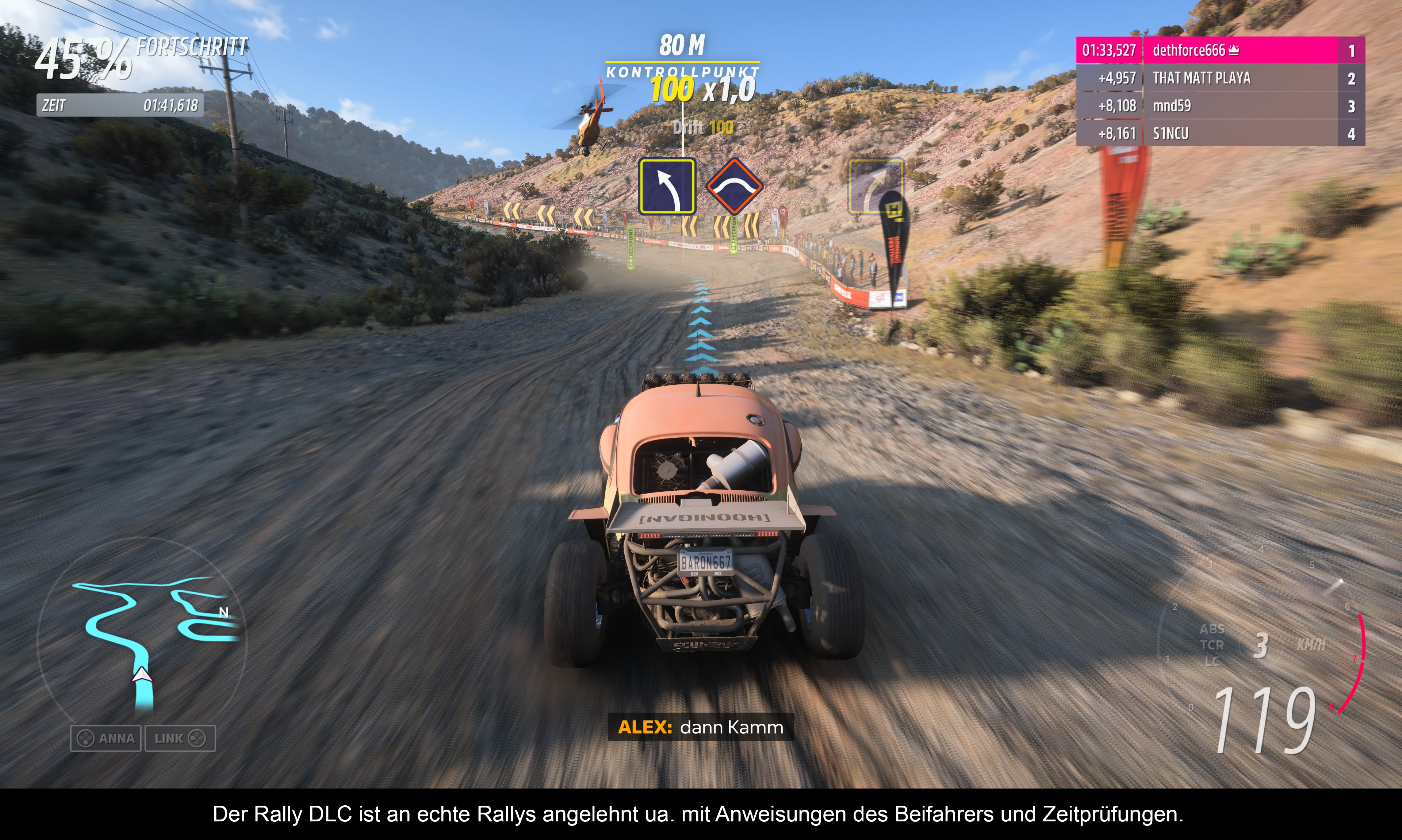 Eine umfassende Story für die Kampagne gibt es nicht. Ich glaube, der einzige Teil, der so etwas bot, war das erste „Horizon“. Was man hier vorgesetzt bekommt, sind eher Mini-Storys: Man kann das Verhältnis von Alejandra zu ihrem Vater und dem VW Käfer nacherleben. Oder man zeigt einigen Schnöseln, wie man richtig mit Sportwagen umgeht. Auch im wissenschaftlichen Umfeld kann man sich betätigen, und zwar bei den Testfahrer-Missionen für die Universität. Bei den Typen von Donut Media lernt man dagegen, dass man Autos entweder mit teuren oder billigen Teilen tunen kann. Diese Geschichten sind qualitativ kaum der Rede wert, funktionieren aber trotzdem recht gut. Schließlich werden all diese Missionen mit Sternen bewertet (wie auch alle anderen Prüfungen). Es wäre allerdings wünschenswert, wenn man die Zwischensequenzen zumindest beim Wiederholen überspringen könnte. Nebenbei gibt es natürlich noch Schaurennen und bestimmte Highlights wie den Titan oder den Kolossus. Überall winken zusätzliche Belohnungen. Auf der Karte finden sich auch viele Herausforderungen wie Sprünge, Wegfinder, Blitzer und Drift-Zonen. Während diese Elemente in „The Crew Motorfest“ irgendwann eher nerven, machen diese Prüfungen in „Horizon“ auch nach dem fünfzigsten Mal noch Spaß. Das liegt aber vielleicht auch daran, dass externe Faktoren wie die CPU-Fahrer unsichtbar gemacht werden und man sich wirklich auf die Herausforderung konzentrieren kann.