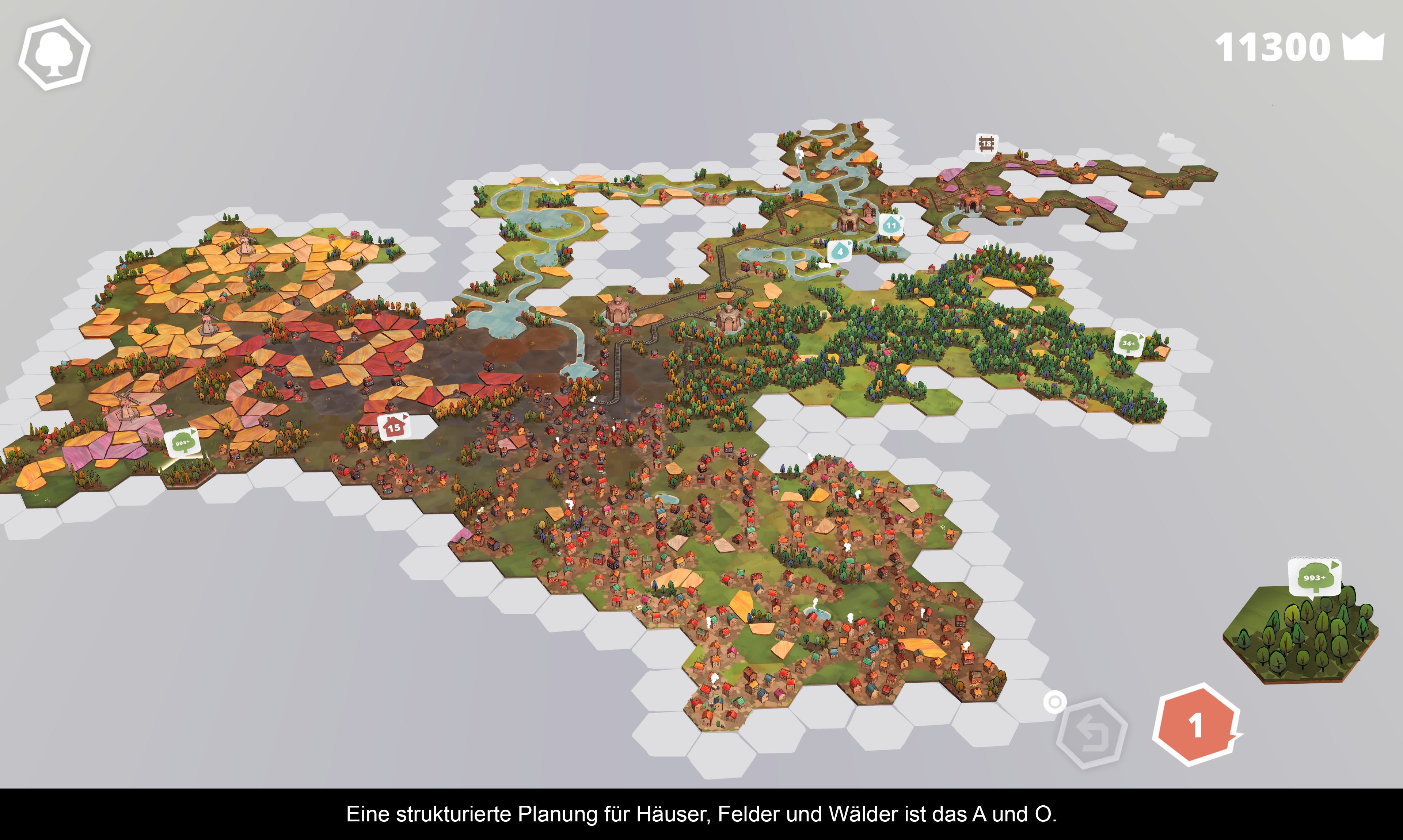 Ihr beginnt mit einem Sechseck, das eine grüne Wiese darstellt. Rechts daneben findet ihr einen Stapel weiterer sechseckiger Plättchen. Hier zieht ihr immer das nächste Element und platziert es in der Landschaft. Jedes Sechseck kann verschiedene Biome zeigen, die sich aus Wäldern, Häusern, Feldern, Bahngleisen, Gewässern und Wiesen zusammensetzen. Entsprechend werden die Felder aneinandergelegt und ihr erhaltet Punkte. Je mehr passende Felder das Plättchen hat, desto mehr Punkte gibt es. Soweit der einfache Teil. Einige Felder haben jedoch Quests, die es zu erfüllen gilt. Dafür müssen mehrere solcher Biome verbunden werden. Jeder erfüllte Auftrag oder jedes perfekt platzierte Plättchen gibt ein weiteres Plättchen in den Stapel zurück und verlängert somit das Spiel. Das Spiel ist zu Ende, wenn alle Sechsecke im Stapel platziert wurden.