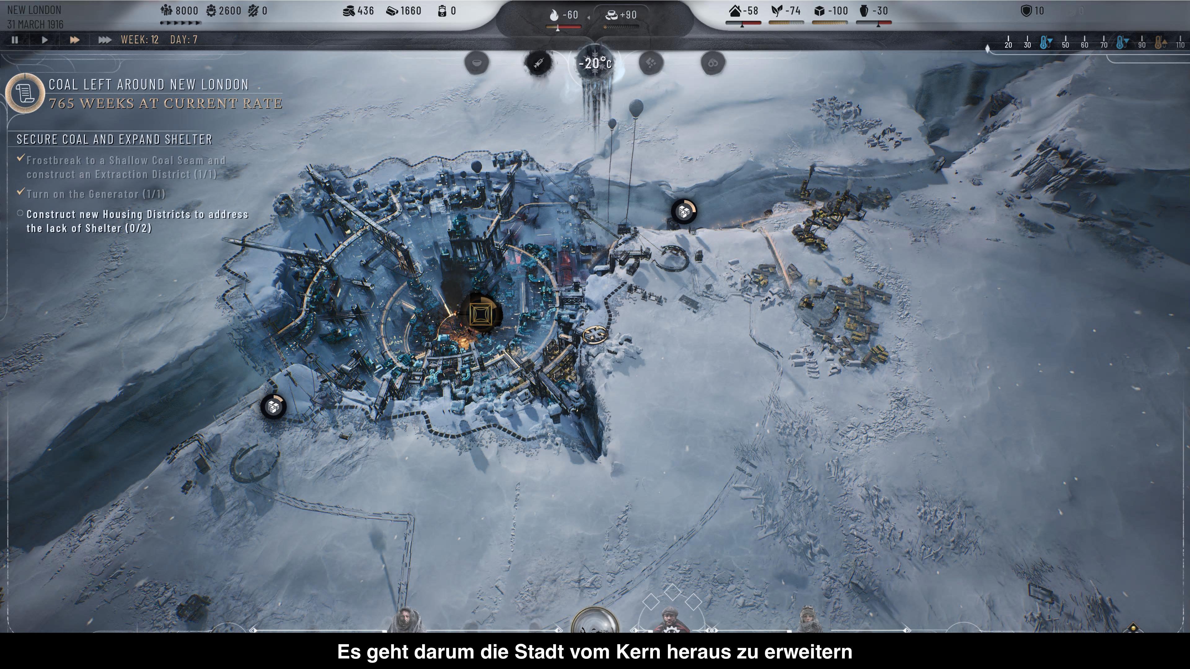 Frostpunk 2 führt die Geschichte des Vorgängers quasi fort. Die Welt ist immer noch von einer erneuten Eiszeit bedeckt, die es den Menschen fast unmöglich macht zu Überleben. Doch nach Teil 1 konnte sich zumindest eine Kolonie an einem neuen Ort sesshaft machen und dort einige Zeit überleben. Doch der alte Führer ist gestorben und so zeigen sich sofort unterschiedliche Fraktionen, die nun um die Macht kämpfen. Hier kommt ihr ins Spiel, um das Überleben der Kolonie zu sichern und sich gleichzeitig mit den unterschiedlichen Fraktionen auseinanderzusetzen. Auch wenn einige Konzepte des Vorgängers umgeworfen wurden, bleibt die Basis die Gleiche. Ihr sucht auf eurer Karte nach Rohstoffen, die ihr abbaut und sorgt außerdem für genügend warme Behausung, damit niemand erfriert. Das ist wie schon im Vorgänger ein nie endender Kampf, denn Rohstoffe sind knapp und so werdet ihr bald schon Expeditionen in die Welt losschicken, um neue Gebiete oder Rohstoffe zu erschließen. Das alles kennt man quasi schon aus dem Vorgänger.