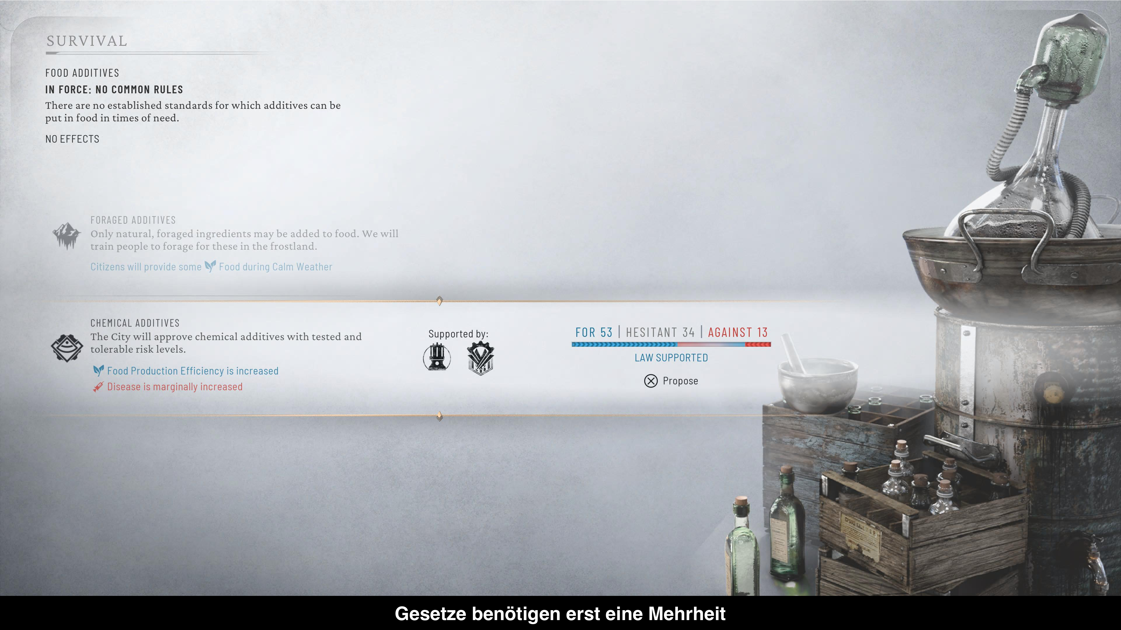 Neu hinzugekommen ist der politische Aspekt. Denn die unterschiedlichen Fraktionen, aber auch die Menschen, werden nicht müde Forderungen zu stellen. Mal fehlt es an Essen, dann gibt es zu viel Kriminalität oder die Schulbildung will definiert werden. Dabei könnt ihr aber nicht einfach nur entscheiden. Ihr müsst im demokratischen Prinzip für Mehrheiten sorgen, beispielsweise in dem man manchen Fraktionen Gefallen verspricht. Das könnte ein bestimmtes anderes Gesetzesvorhaben sein oder eine neue Technologie soll erforscht werden. Denn jede Fraktion hat ihre eigenen Ideologien, Wünsche und Prinzipien. Jede Entscheidung zieht also Konsequenzen nach sich und man sollte aufpassen. Denn wenn es schlecht läuft, kann man euch ganz schnell das Vertrauen entziehen und absetzen. All das funktioniert erstaunlich gut und bringt einen erfrischenden Aspekt heraus, der euch wieder zu den schwierigen Entscheidungen zwingt.