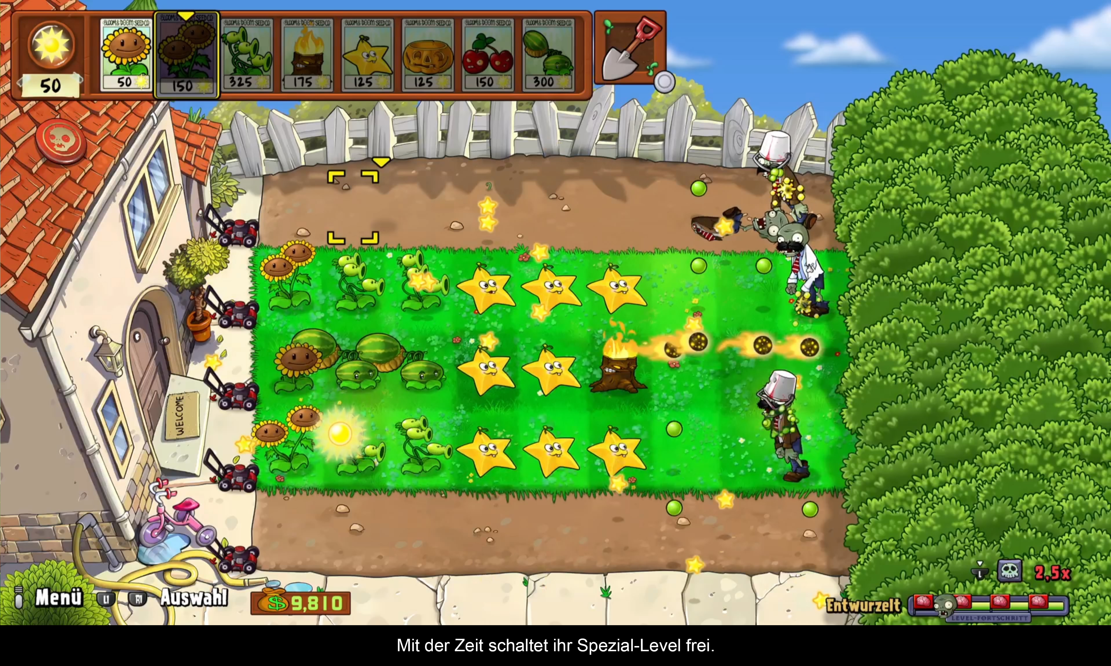 Smartphone-Spiele im Jahr 2009 waren einfach gestaltet und dienten der schnellen Unterhaltung. Mikrotransaktionen setzten sich langsam durch und sollten die Spieler mit einfacher Mechanik und wenig Handlung ans Gerät fesseln. Das Ziel war dabei immer, Geld zu generieren. Deswegen gibt es hier auch keine große Handlung. Es geht nur um Daves Garten, der von Zombies überrannt wird, die nicht unbedingt sein Gehirn gefressen haben wollen. Deine Aufgabe ist es, ihn davor zu beschützen, indem du Pflanzen setzt, die sein Heim und sein Hirn verteidigen. Warum ausgerechnet Pflanzen? Das wissen nur die Designer:innen, aber gerade diese ermöglichen ein erstaunlich kreatives Tower-Defense-Design! So kämpft man sich durch fünf Welten, bis man schließlich dem Oberbösewicht gegenübersteht. Ist dieser erledigt, gibt es ein kurzes Outro und das war es dann schon. Aber wer spielt PvZ schon wegen der Handlung?