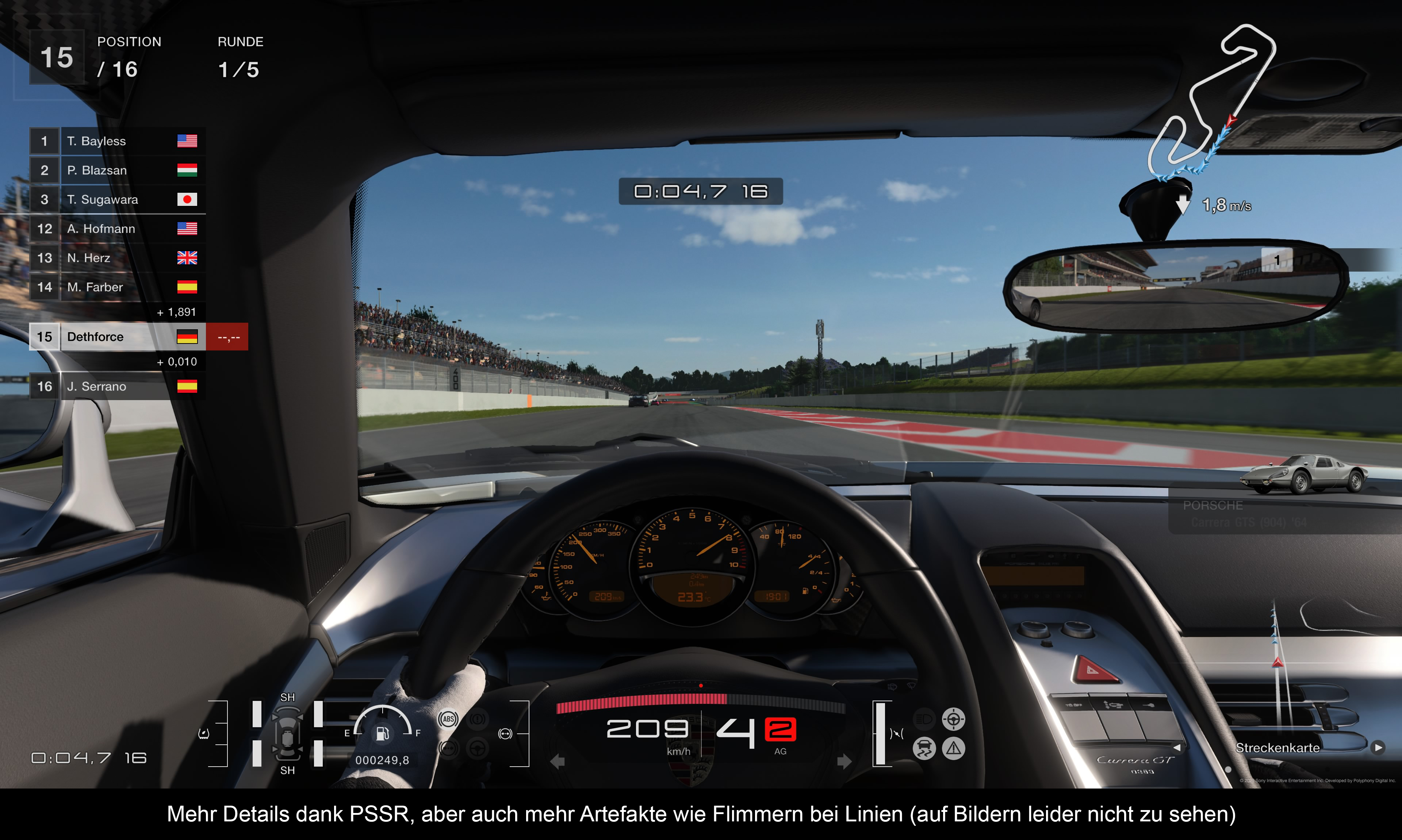 Weitere Höhepunkte der Updates waren sicherlich das im Juli überarbeitete Physikmodell, das vor allem bei Offroad-Rennen deutlicher zum Tragen kommt, sowie das PS5-Pro-Update, das Ende November 2024 mit einiger Verspätung veröffentlicht wurde. Letzteres war anfangs nicht gerade das Gelbe vom Ei. Zuvor konnte man das Spiel ohne spezifische PS5-Pro-Anpassungen im Quality-Modus laufen lassen und erhielt im Gegensatz zur normalen PS5 eine stabile 60-fps-Framerate. Das eigentliche PS5-Pro-Update (Version 1.54) spendierte dem Spiel dagegen noch ein paar zusätzliche Optionen. Neben einem optionalen 8K-Modus gab es in dem Update auch verbesserte Rendertechniken bei Nutzung einer VR-Brille. Darüber hinaus wurde Ray-Tracing in verschiedenen Modi implementiert, wobei die Bildqualität bei solchen Features bis heute kriselig und verwaschen ist. Viel wichtiger war jedoch der Support für die PlayStation Spectral Super Resolution (PSSR)-Technik. Damit läuft das Spiel im Prinzip mit einer wesentlich niedrigeren Auflösung, die durch die PSSR-Technik hochskaliert wird, sodass am Ende ein wesentlich feiner aufgelöstes Bild entsteht, ohne dass es zu Einbußen bei der Framerate kommt. Zumindest in der Theorie, denn praktisch war die Integration unter aller Sau: Das Ergebnis sah in den ersten Monaten grobschlächtig und niedrig aufgelöst aus, es gab viele Artefakte und regelrechtes Kantenflimmern bei feinen Linien, die vor allem diagonal verliefen (wie Stromleitungen). Allerdings hat sich das mit der Zeit wesentlich gebessert, sodass das Spiel mittlerweile besser aussieht als zum Start. Alles ist hochaufgelöst, viele Details sind jetzt auch in der Ferne perfekt erkennbar und die Cockpits/Autos sehen noch einmal ein Stück besser aus. Artefakte gibt es aber immer noch.
