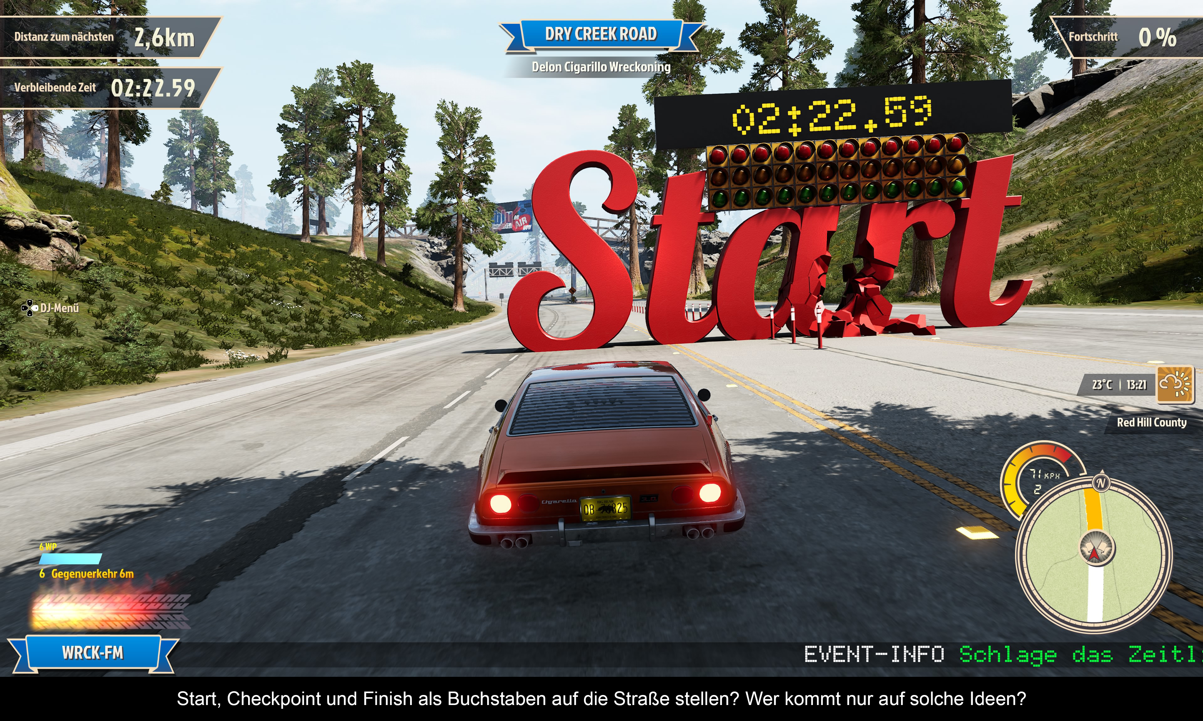 Natürlich kann man sich bei anderen Spielen inspirieren lassen. Aber man sollte niemals schamlos kopieren, denn der Grat zwischen Inspiration und schnödem Abklatsch ist äußerst schmal. "Wreckreation" bedient sich für meinen Geschmack etwas zu sehr am Design von "Burnout Paradise". Doch der Reihe nach: Der Entwickler Three Fields Entertainment wurde von ehemaligen Mitarbeitern von Criterion Games gegründet, darunter Alex Ward, einer der Köpfe hinter der ursprünglichen „Burnout“-Serie. Aber das ist auch schon eine Ewigkeit her und manche Designentscheidungen haben sich am Ende auch nicht als Gewinn entpuppt. So musste man die Spielwelt beispielsweise nicht für bildschirmfüllende Menüs verlassen, um Optionen zu ändern. Die Alternative dazu war jedoch ein winziges Messenger-Menü, welches über das Steuerkreuz bedient wird. Es gibt auch mehrstufige Burnout-Balken, Tore für Abkürzungen und Werbetafeln. Wie im Vorbild startet man Rennen, indem man die Tasten L2 und R2 gleichzeitig drückt. Auf jeder Straße kann man Rekorde erzielen, sei es durch den längsten Drift oder die schnellste Durchfahrt. In Echtzeit kann man sich dann mit Freunden messen und deren Rekorde überbieten. Wenn das Auto gewechselt werden soll, wird auf einen Schrottplatz gefahren… ach nee, hier ist es ein Parkplatz und die Karre wird gewechselt. Das war schon in „Burnout Paradise” umständlich und ist es heute umso mehr. Zudem existiert von jedem Fahrzeug eine getunte Version, für die man jedoch eine spezifische Herausforderung bestehen muss. Ist das Fahrzeug beschädigt, fährt man zur nächsten Tankstelle und lässt es von magischer Hand reparieren. Crashs gehören natürlich auch zum Tagesgeschäft. Der Aftertouch wurde dabei 1:1 aus der Vorlage übernommen. Mit diesem Manöver lässt sich das Wrack noch ein wenig bewegen, um auch die Gegner in einen Unfall zu verwickeln.