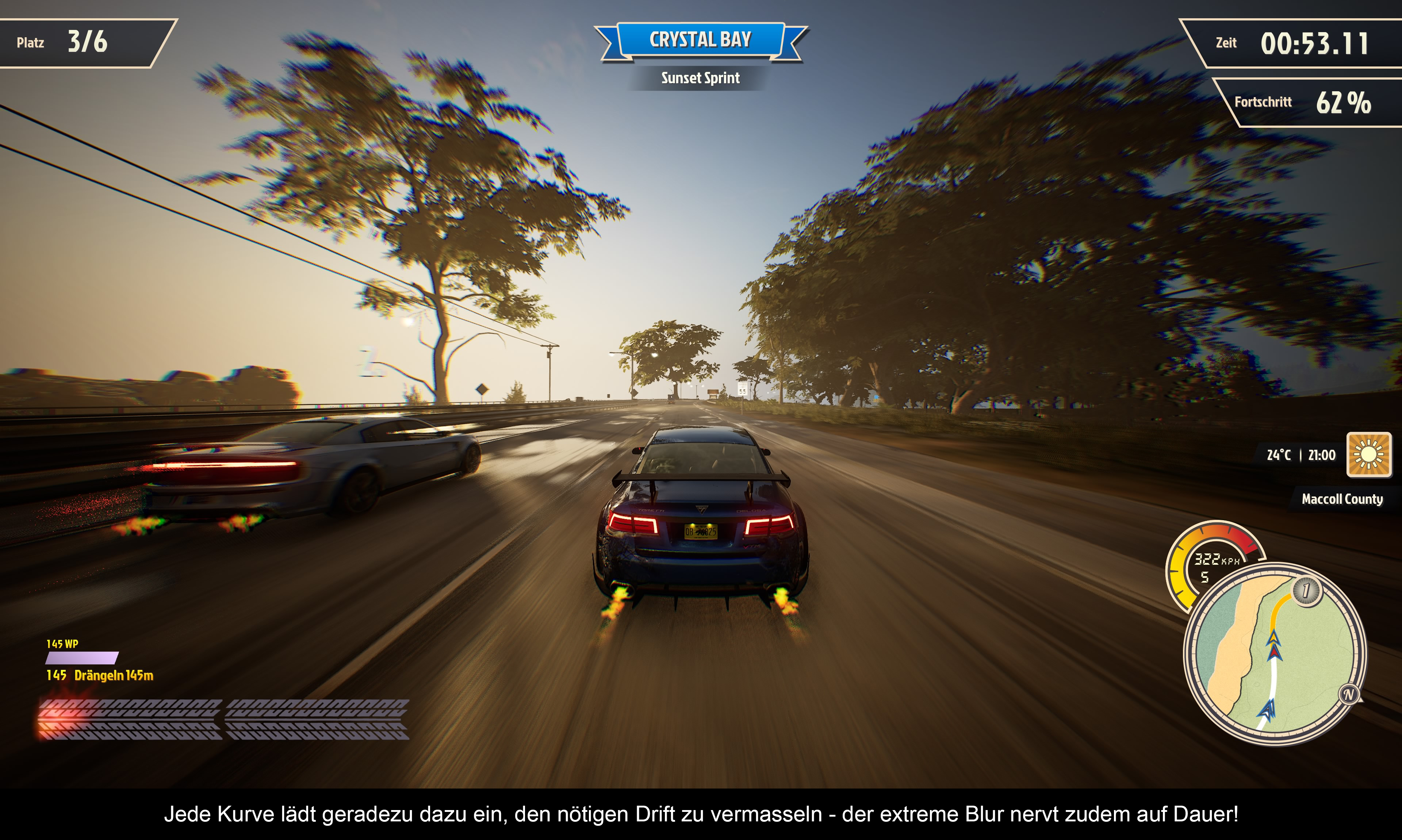 Neben der enttäuschenden Technik nervt vor allem ein klitzekleines Detail. Jedes Rennen oder Event wird von einer Ansagerin kommentiert. Selbst dann noch, wenn man es bereits zum hundertsten Mal wiederholt hat! Bei jedem Start wird von vorne losgelabert! Auf Dauer geht einem das so dermaßen auf den Keks. Am liebsten will man den Ton komplett ausstellen. Dann verpasst man allerdings auch den umfangreichen Soundtrack mit seinen vielen verschiedenen Musikrichtungen im Radio-Format. Dabei gibt es nicht nur Klasse, sondern auch viel austauschbare Masse. Das ist aber immer noch besser, als die Pieps-Geräusche zu ertragen, die ertönen, wenn man in der Umgebung etwas aufdeckt.