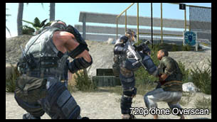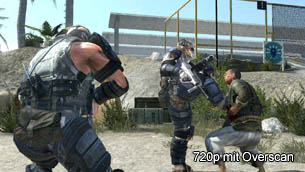 Auf Bildern sehen EA Spiele immer gut aus, aber in Bewegung machen sich oft gravierende technische Mängel bemerkbar. Beständiges Ruckeln (Need for Speed. ProStreet), derbe Slowdowns (Medal of Honor: Airborne) und eine niedrige Framerate (.skate) sind nur einige Beispiele dafür. Bloß gut, dass „Army of Two“ von diesen Symptomen verschont bleibt. Selbst im Splitscreenmodus läuft das Geschehen flüssig und bis auf den Effektoverkill in der Flugzeugträgermission kann man auch nicht von vielen Slowdowns sprechen. Allerdings hat diese Optik seinen Preis: Das Spiel läuft nicht in 720p, sondern nur in 685p. Um ohne lästigen schwarzen Rahmen zu zocken, muss der HD TV somit „Overscan“ unterstützen. Von diesem Makel und einem derben Bug (Freeze) gleich zu Beginn in Somalia (Innenhof) abgesehen, fällt der Titel recht hübsch und zufrieden stellend aus. Salem und Rios sehen detailliert und mit ihren Panzerplatten auch ziemlich cool aus, die Gegner treten vielfältig auf und die Animationen aller Figuren gehen als geschmeidig durch. Die Umgebungen wirken zwar manchmal etwas blass, bieten dafür aber viel Abwechslung (Somalia, Afghanistan, Irak usw.) und werden immer am Tage durchforstet. Die englische Sprachausgabe passt sehr gut zu den beiden Söldnern und diese geizen auch nicht mit platten Sprüchen (immerhin kämpfen sie nur für Geld). Musik wird dagegen nur spärlich eingesetzt, was aber auch nicht weiter schlimm ist, denn die Soundeffekte sind extrem gut umgesetzt wurden. Wenn links und rechts die Kugeln einschlagen, wummst es ein ums andere Mal fett aus den Boxen. Beeindruckend!