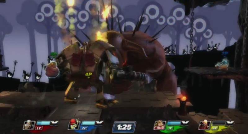 Grundlegend gibt es in PASBR zwei Spielmodi: Team Kampf oder „Jeder gegen Jeden“. Bei beiden Spieler Modi können bis zu vier Spieler gleichzeitg, online und offline, gegeneinander antreten. Wer auf der Suche nach einem 1vs1 Kampf ist, muss sich umständlich einen Freund einladen. Es fehlt leider auch vollkommen die Möglichkeit online nach diesen Spieltyp zu suchen. Sehr ärgerlich, wenn man bedenkt, dass man vor allem Beat em Up Profis ansprechen will. Hat man sich aber für einen Modus entschieden, bleiben nur noch die Siegesbedingungen einzustellen. Hier stehen drei Optionen zur Verfügung, soll es über eine bestimmte Zeit gehen, soll der Spieler mit den meisten Punkten gewinnen oder gibt es ein Lebenslimit. Hat man alle Optionen gewählt, fehlt nur noch der Austragungsort. Insgesamt stehen euch 14 Arenen und sechs Trainingslevel zur Verfügung. Die Trainingslevel sind, wie es der Name vermuten lässt, sehr einfach gehalten, das wahre Highlight sind die Arenen, da diese aus zwei Spielen zusammen gesetzt wurden. Da kommt es schon mal vor, das man in der Unterwelt von God of War auf die kleinen Krieger aus Patapon trifft. Diese sind bei ihrem Beutezug auf Hades gestoßen und bekämpfen ihn. Dieser Kampf ist nicht nur optisches Beiwerk, sondern wirkt sich auch auf die Arena aus. Bei den Angriffen von Hades werden neue Plattformen geschaffen, während die Spieler von den Speeren der Patapons getroffen werden. Diese Fallen entziehen dem Spiel nicht nur All-Star Power, sondern können ihn auch lähmen und machen ihn zu einem leichten Ziel für die Gegner. Glücklicherweise konzentrieren sich diese Angriffe nur auf einen Abschnitt der Arena und werden optisch wie akustisch hervorgehoben. Als wäre das nicht schon hektisch genug, erscheinen in regelmäßigen Abständen Items in der Arena, welche von jedem Spieler genutzt werden können. Man findet unter anderem die Nano Tech Kiste aus Ratchet & Clank oder die Rail Gun aus Metal Gear Solid. Jedes dieser Items hat eine spezielle Eigenschaft, welche dem Gegner stark zusetzen können. Glücklicherweise kann man in den Optionen Fallen wie auch Items aus der Arena verbannen, damit sich die Spieler auf ihre Fähigkeiten verlassen und nicht auf die Glückskomponente.