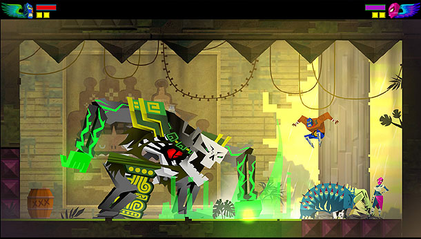 Wie bereits verraten, seid ihr ein Luchador und müsst euch im besten 2D-Stil durch vielzählige Welten kämpfen. Dabei stehen euch ein paar kleinere Combos zur Verfügung und im Laufe der Zeit erhaltet ihr dank einer alten Ziege einige weitere Tricks, die euch im Kampf etwas Abwechslung besorgen. Aber dadurch zieht auch der Schwierigkeitsgrad ziemlich an. Denn während am Anfang die Gegner mehr oder weniger hirnloses Kanonenfutter sind, kommen später Gegner ins Spiel, die von euch verlangen, dass ihr die neu erlernten Angriffe im Kampf auch verwendet, wenn man weiterkommen möchte. Denn manche Gegner verfügen über Schilde, die sich nur mit Angriff XY brechen lassen und andere greifen aus dem Boden an, wenn man sie nicht mit einem Angriff herausschlägt. Jedoch besteht das Spiel nicht nur aus Kämpfen, sondern fast noch aus mehr Geschicklichkeit. Denn oftmals müsst ihr die erlernten Angriffe und Moves in halsbrecherischen Aktionen kombinieren, um neue Areale des Spiels zu erreichen. Dabei wird aber auch etwas Gehirnschmalz benötigt, da die Lösung nicht immer offensichtlich ist. Trotzdem bleibt das Spiel immer fair, denn obwohl das Spiel immer schwieriger wird, werden auch die eigenen Fähigkeiten in der Steuerung immer besser und so wird man immer genau richtig gefordert. Besonders die Endgegner seien hier zu erwähnen, die einen wirklich auf die Probe stellen und teilweise auch für Frust sorgen können. Sobald man aber deren Angriffspaletten gelernt hat, sind auch diese kein großes Problem mehr.