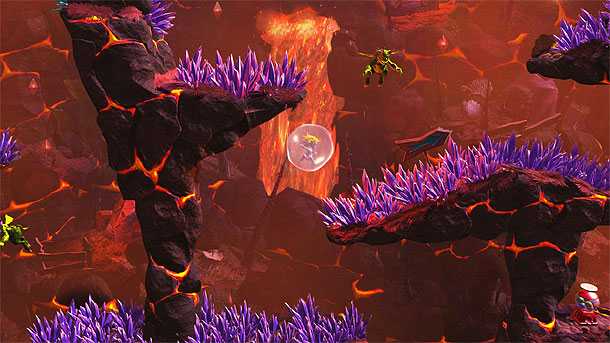Während man mit der Punk Version von Giana durch wunderschöne und bunte Landschaften springt und man harten Gitarrenriffs lauscht, muss sich die blonde und liebliche Giana mit einem ungemein düsteren Setting zufriedengeben. Dieser Wechsel geht so perfekt und nahtlos ineinander über, dass man sich immer wieder dabei ertappt zwischen den Welten zu wechseln, nur um zu schauen, was sich alles ändert. Allerdings hat der Wechsel nicht nur optische und akustische Änderungen zu bieten. Versperrt in der kunterbunten Welt noch eine Brücke, ein Brunnen oder Gestrüpp den weiteren Weg, so kann es in der düsteren Welt schon ganz anders ausschauen. Aber auch die Gegner verändern sich (z.B. sind rote und weiße Geister jeweils nur in einer Welt gefährlich), wie auch Fahrstühle oder Türen. Des Weiteren kann die punkige Giana nur rote Diamanten einsammeln, während die blonde Giana nur die gelben einsammeln darf. Wie man schon erahnen kann, wird es wie bei „Outland“ in späteren Levels ein stetiges Wechseln der Welten geben, damit man eine Chance hat den Levelausgang zu sehen. Wobei spätere Levels schon geschmeichelt ist. So zieht der Schwierigkeitsgrad sehr früh sehr stark an, was für Frust sorgen könnte. So muss man seine Sprünge schon sehr genau platzieren und das Wechseln der Welten sollte auch schnell verinnerlicht werden. Besonders, wenn man es auf die großen Edelsteine (beim Einsammeln einen Artworks abgesehen hat. Immerhin gibt es unendliche Leben und viele gut gesetzte Rücksetzpunkte. Für Masochisten gibt es aber noch zwei weitere Schwierigkeitsgrade zum Freischalten, wo ihr entweder ohne Rücksetzpunkte oder nur mit einem (!!) Leben auskommen müsst.