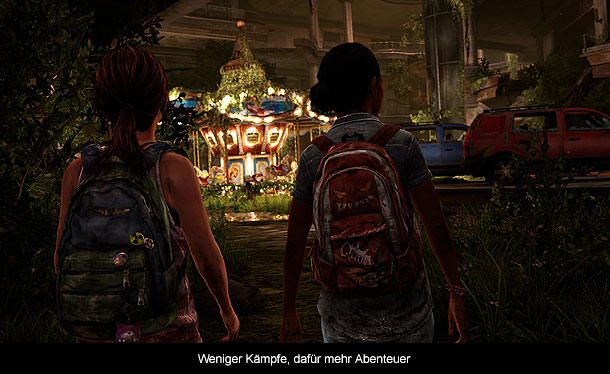 Spielerisch unterscheidet sich Left Behind kaum vom Hauptspiel. Man spielt weiterhin aus der dritten Person und kann mit Ellie die Welt erkunden. Dabei hat man aber Wert auf die Stärken von „The Last of Us“ gelegt und daher ist man oft mit dem Erkunden der Welt beschäftigt oder lauscht äußerst interessanten Gesprächen und ist begeistert über die vielen kleinen Details, die man in der Welt entdecken kann. Trotzdem trifft man früher oder später auch auf die Infizierten und muss sich dann natürlich auch mit den zur Verfügung stehenden Mitteln zur Wehr setzen. Dabei kommt auch wieder das Crafting-System zum Tragen in dem man gewisse Waffen und Medi-Packs mit diversen Ressourcen herstellen kann. Natürlich sind alle Ressourcen knapp gesät und jeder Schuss sollte sitzen. Trotzdem wurden die Auseinandersetzungen glücklicherweise auf ein Minimum begrenzt und oftmals ist es schlauer sich vorbei zu schleichen, als die offene Konfrontation zu suchen, in der man meist den Kürzeren ziehen wird. Dabei kommt einem zu Gute, dass in dem DLC erstmals auch drei Parteien aufeinandertreffen. Das heißt man kämpft gleichzeitig gegen Infizierte und Menschen und wer sich schlau anstellt, kann dies zu seinem Vorteil nutzen. So bekommen viele Kämpfe noch eine weitere taktische Ebene.