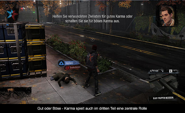 Spielerisch dürften sich Kenner der Vorgänger bei „inFAMOUS: Second Son“ sofort wieder wohl fühlen. Obwohl die Elektrokräfte den Rauchkräften weichen mussten, gibt es spielerisch große Ähnlichkeiten. So kann man wieder Geschosse abfeuern, im Nahkampf mit einer Kette kämpfen oder auch Rauchbomben und ähnliches ablegen. Die Besonderheit bei „inFAMOUS: Second Son“ ist jedoch, dass es nicht nur eine Kraft gibt, sondern gleich mehrere. Die unterscheiden sich dann im Kampf, wie in der Fortbewegung. Beispielsweise kann man mit den Rauchkräften problemlos durch Gitter hindurch gleiten oder mittels Luftschächten die Gebäude in Sekundenbruchteilen erklimmen. Mit einer anderen Kraft, wie der aus den Trailern bekannten Neonkraft kann man dagegen diese Dinge nicht tun, aber unglaublich schnell rennen und das sogar Häuserwände herauf und Gegner mittels gezielten Schüssen festketten. Mit den weiteren Kräften sind ähnliche Dinge möglich und die Kunst liegt darin alle Kräfte passend zu kombinieren. Gewechselt wird zwischen den Kräften übrigens indem man die passende Grundlage, also z.B. Rauch oder Neon, aufsaugt, um sich zu stärken. Eine Combo aus einem Rauchschuss gefolgt von einem Neonball funktioniert also nicht. Man merkt dabei aber auch recht schnell, dass man zur Fortbewegung die Kräfte nutzen soll. Denn wenn man versucht, wie in den Vorgängern an den Häusern hoch zu klettern, wird merken, dass dies alles andere als geschmeidig von statten geht. Man bleibt gerne mal hängen, kommt nicht weiter, obwohl dort ganz klar ein Vorsprung ist oder wird wegen einem blöden Fehler sogar runtergeworfen. Alles etwas ärgerlich, aber dank der Kräfte ist dies kein großes Problem. Ansonsten gibt es die gewohnt offene Welt, die man völlig frei erkunden darf und in der man neben den Hauptmissionen noch einige Nebenaufgaben findet. Beispielsweise darf man die Stadt mit seinen Graffitis besprühen, gefangene Conduits befreien oder auch nach Scherben Ausschau halten mit denen man seine Kräfte verbessern kann. Wieder mit von der Partie sind natürlich die moralischen Entscheidungen. In manchen Missionen wird man vor die Wahl gestellt sich für das Gute oder Böse zu entscheiden, was dann den weiteren Spielverlauf beeinflusst und auch die eigenen Kräfte. Denn gute bzw. böse Spieler erhalten leicht andere Kräfte. Dabei muss man auch sonst aufpassen, denn wer gut sein möchte, muss Zivilisten beschützen und aus Kämpfen heraushalten, während man als böser Spieler auf niemanden Acht geben muss. Um aber alles gesehen zu haben, wird man die zwei Spieldurchgänge für Gut und Böse benötigen und so dürfte man auf seine 25-30 Stunden Spielzeit kommen, wenn man alle Nebenaufgaben erledigen möchte.