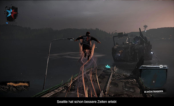 „inFAMOUS: Second Son“ ist ein Open World Spiel und diese sehen von Natur aus meist etwas schlechter aus als das was man sonst auf einer Konsole zu sehen bekommt, weil natürlich viel mehr los ist in einer riesigen Stadt als in einem Schlauchlevel eines Shooters. Daher ist es umso höher anzurechnen, was Sucker Punch mit „inFAMOUS: Second Son“ abgeliefert hat. Denn das Spiel ist auf der PlayStation 4 das definitiv schönste Spiel und läuft zudem in 1080p bei 30 Bildern pro Sekunde, die man nahezu auch jederzeit halten kann. Nur ganz selten bricht die Bildrate mal etwas ein und selbst dann ist man vor nervigen Effekten, wie Tearing oder Aliasing geschützt. Dabei erhält man nicht nur astrein modellierte Charaktere mit allerlei Details, sondern auch eine große und lebhafte Welt, die zu jederzeit perfekt in Szene gesetzt wird. Dies ist vor allem der genialen Beleuchtung mit den dynamischen Schatten zu verdanken. Vor allem nachts kommt man aus dem Staunen nicht mehr heraus, wenn Neonlichter leuchten, Fahrzeuge ihr Scheinwerferlicht werfen und dabei der Regen für tolle Spiegelungen sorgt. Einzig der Schatten Delsins ist etwas komisch, denn nicht immer ist einer zu sehen. Die Entwickler erklären dies damit, dass dies nachts ausgeschaltet wird, weil bei so vielen Lichtquellen der Schatten eh nicht zu sehen wäre und es somit nur unnötig Rechenleistung verbrauchen würde. Die meiste Zeit geht die Rechnung auch auf, aber manchmal gibt es doch ein Licht und man sieht dann keinen Schatten, was etwas komisch aussieht. Kein großartiges Problem, aber eben doch ein einziger Kritikpunkt in Sachen Grafik. Denn ansonsten erhält man mit der Beleuchtung und den Partikeleffekten der Kräfte einfach etwas geboten, was man so noch nicht gesehen hat. Dagegen können sogar Spiele, wie „Killzone: Shadow Fall“ einpacken. Übrigens hat Sucker Punch sich für die Stadt die amerikanische Großstadt Seattle als Vorbild genommen. Zwar gibt es kein detailgetreues Abbild der Stadt, aber die wichtigsten und markantesten Punkte gibt es auch im Spiel, wie die weltbekannte Space Needle. Ortskundige dürften noch viel mehr Orte finden.