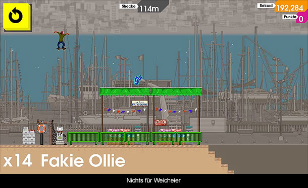 Neben den 50 normalen Parcours gibt es zudem noch 50 Spots zu meistern. Um diese freizuschalten, muss man ebenfalls einfach den entsprechenden Level hinter sich bringen. Bei den Spots geht es schließlich darum, dass Level ohne den Boden zu berühren zu beenden, was einen ziemlich viel Fingerfertigkeit und Timing abverlangt. Doch damit noch nicht genug an Aufgaben, welche den Spieler bei Laune halten sollen. So gibt es tägliche Online Herausforderungen, wo man zwar unendlich viel trainieren kann, aber einmal scharf geschaltet nur einen Versuch hat, seinen perfekten Run auf den Asphalt zu bringen. Letztendlich kommen so weit über 100 Levels zustande, was einem recht lange bei Laune halten wird.