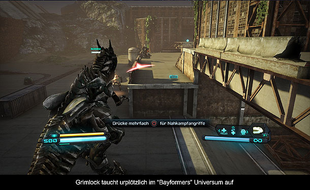 Spielerisch gibt es nix Neues zu berichten. Der Titel ist ein typischer Third-Person Shooter. Wer die Vorgänger kennt, findet sich auch im neuen Spiel sofort zurecht. Jeder Bot ist mit einer normalen und einer schweren Waffe ausgerüstet. Diese lassen sich an Terminals austauschen und aufleveln. Zusätzlich gibt es noch Hacks also Items, die man einmal benutzen darf (Geschützdrohne, Reperaturstrahl usw.) und eine spezifische Spezialfertigkeit. Das kann ein Kletterhaken sein, oder wie bei Shockwave eine limitierte Tarntechnologie. Die titelgebenden Transformationen spielen dagegen kaum eine Rolle. Im Fahrzeugmodus steuern sich die Bots fast genauso wie im Robotermodus. Dank der engen Gänge und schlauchigen Pfade kann man so den Vorteil der Fahrzeughülle kaum nutzen. Überhaupt ist alles recht linear gehalten und es gibt nur wenig Abwechslung. Rätsel sucht man gar komplett vergebens und die paar Bosskämpfe hauen auch niemanden vom Hocker. Auch wirkt das Crossover irgendwie unfertig. Während man in den „Cybertron“ Abschnitten zwischen Autobots und Decepticons wechselt, spielt man in den „Bayformers“ Levels nur mit Optimus Prime und Co. Aber das ist wiederum auch kein Beinbruch, denn diese Kapitel fallen vor allem grafisch deutlich ab.
