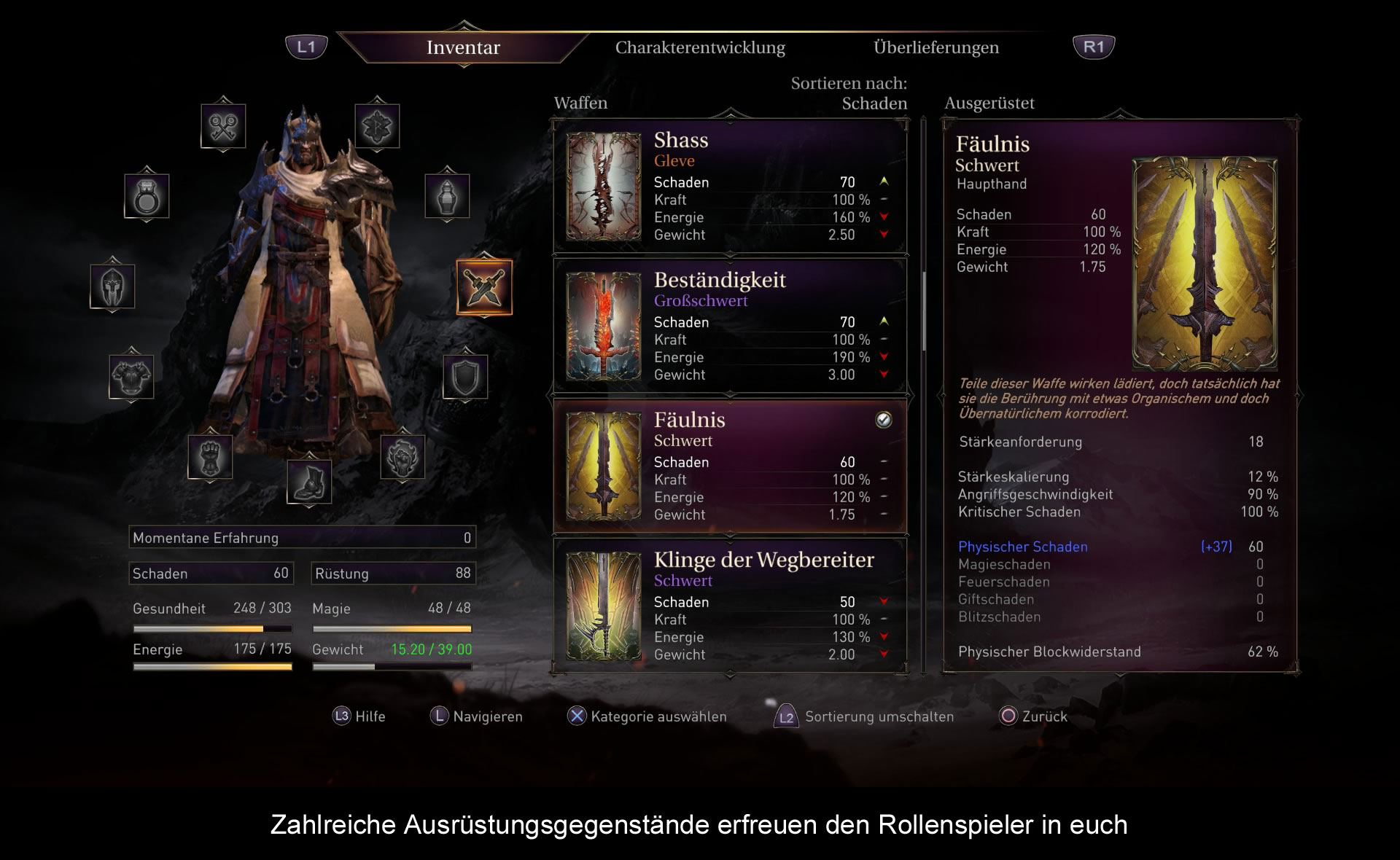 Gameplaymäßig orientiert sich das Spiel offensichtlich an der „Demons“ bzw. „Dark Souls“ Reihe. So hat man zu Beginn des Spiels die Wahl zwischen drei Klassen, die sich in ihren Werten wie Stärke, Agilität & Co. leicht unterscheiden und dementsprechend auch anders spielen. Bei allen Klassen gilt das, aber Vorsicht ist besser als Nachsicht. Jeder Gegner ist eine ernstzunehmende Gefahr und man ist schneller tot, als einem lieb ist. Dabei gilt es in erster Linie den Angriffen der Gegner auszuweichen, um einen gefährlichen Konter setzen zu können. Wer blind drauflosrennt, wird selten Erfolg haben, da sich viele Gegner gekonnt verteidigen können. Die Kunst ist es daher die Angriffe der Gegner auswendig zu lernen und die richtigen Momente zum Angriff abzuwarten. Wichtig ist es auch die Gegner voneinander zu isolieren, da mehrere Gegner gleichzeitig meist das Ende für einen selber bedeuten. Sollte es doch mal zum Bildschirmtod kommen, wird man an einen der spärlich gesetzten Checkpoints zurückversetzt und es beginnt ein Timer. Denn damit die bislang erlangten Erfahrungspunkte nicht komplett verloren gehen, bekommt man noch mal eine Chance und kann an dem Ort seines Todes zumindest einen Teil seiner Erfahrungspunkte zurückerlangen. Leider muss man sich auf dem Weg dahin nicht nur beeilen, sondern auch aufpassen, da alle Gegner wiederbelebt wurden. Wer dann ein weiteres Mal stirbt, verliert die Erfahrungspunkte. Leider ist die Kamera dabei nicht hilfreich und sorgt durch völlig abstruse Kameraeinstellungen gerne mal für einen schnellen Tod. Schafft man es doch mal bis zu einem der Checkpunkte, kann man da seine Lebenspunkte auffrischen und die gesammelten Erfahrungspunkte einlösen, um die Attribute des Charakters zu verbessern. Denn mit besseren Attributen lassen sich auch bessere Rüstungsteile anlegen, die wie in einem RPG üblich unterschiedliche Auswirkungen auf den Charakter haben. So erschweren z.B. schwere Rüstungsteile das Ausweichen per Rolle und eine schwere Axt braucht zwar länger zum Angreifen, macht dafür aber mehr Schaden als ein Dolch. So kann man sich trotz der recht strikten Klassenbeschränkungen dann doch einen Charakter nach eigenen Vorlieben zusammenstellen.