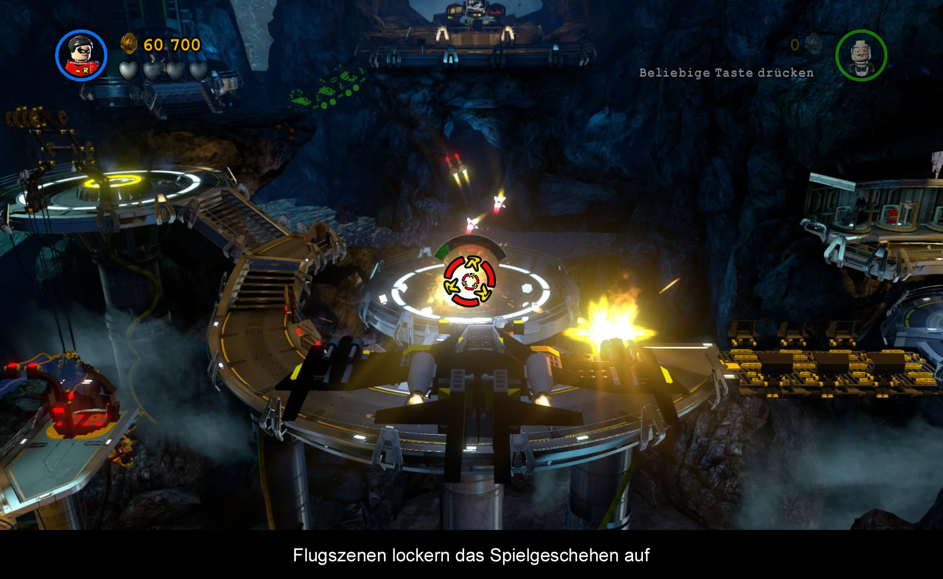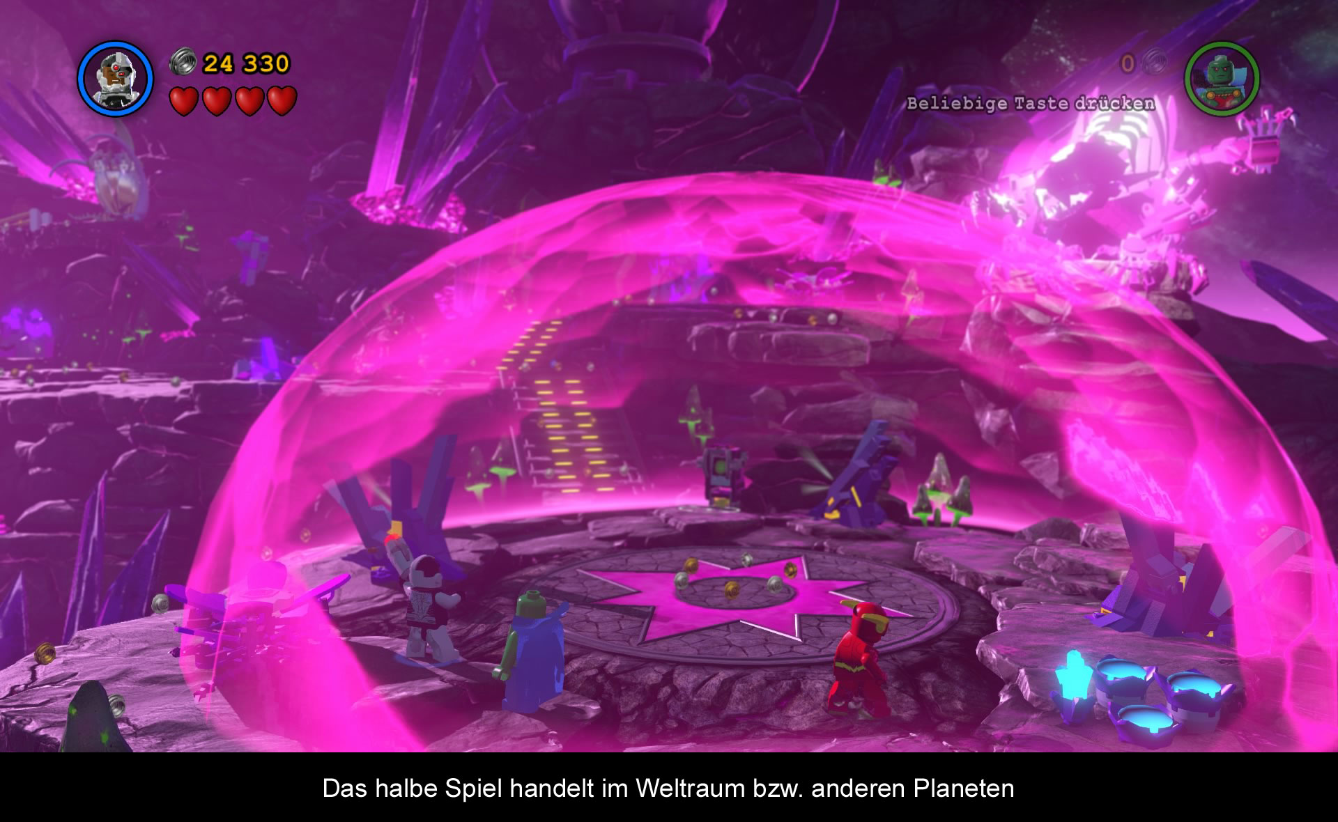 Neu sind auch die kurzen Weltraumschlachten. In einer Art „Resogun“ Manier umkreist man das Feindschiff und schießt die Gegner ab. Das System wurde sehr einfach gehalten und es gibt keine Leben. Hier sind wir wieder beim bekanntesten Kritikpunkt. Es ist kein Geheimnis, dass sich die Spiele an eine jüngere Zielgruppe richten und man die Levels so designt hat, damit diese auch ihren Spaß haben. Aber warum müssen extra erstellte virtuelle Missionen auch so sein? Es ist nett, sich in Sprung und Kampfeinlagen gesondert zu beweisen, doch auch hier gilt das bekannte System der unendlichen Versuche. Sehr schade, denn vorgegebene Schwierigkeitsgrade und Leben würden hier Sinn machen. Auch ein wenig schade ist, dass die offene Spielwelt aus dem Vorgänger wieder gestrichen wurde. Stattdessen gibt es mehrere größere Hub-Welten. Diese sind zwar untereinander verbunden und wurden sogar in die Handlung eingearbeitet, doch irgendwie springt der Funke nicht so recht über. Auch jeder Lantern Planet ist eine kleine, runde Hub-Welt mit verschiedenen Aufgaben und Rennen. Immerhin positiv zu erwähnen ist der Planet Oa, der nichts weiter ist, als eine riesige Rennstrecke. Hier kann man nach Herzenslust die freigespielten Fahrzeuge testen. Die restlichen - üblichen - Kritikpunkte der LEGO Spiele sind auch in „Batman 3“ vorhanden. Der Zwei Spieler Modus funktioniert nur lokal an einem Fernseher, die Kamera irrt oftmals in der Gegend herum, die Steuerung ist total überladen und es gibt zu viele lieblose Quests!