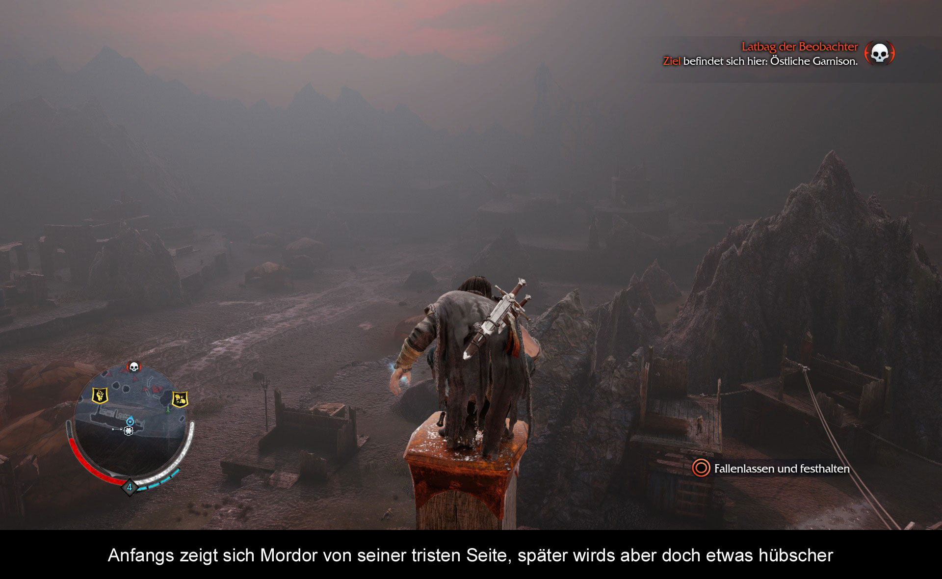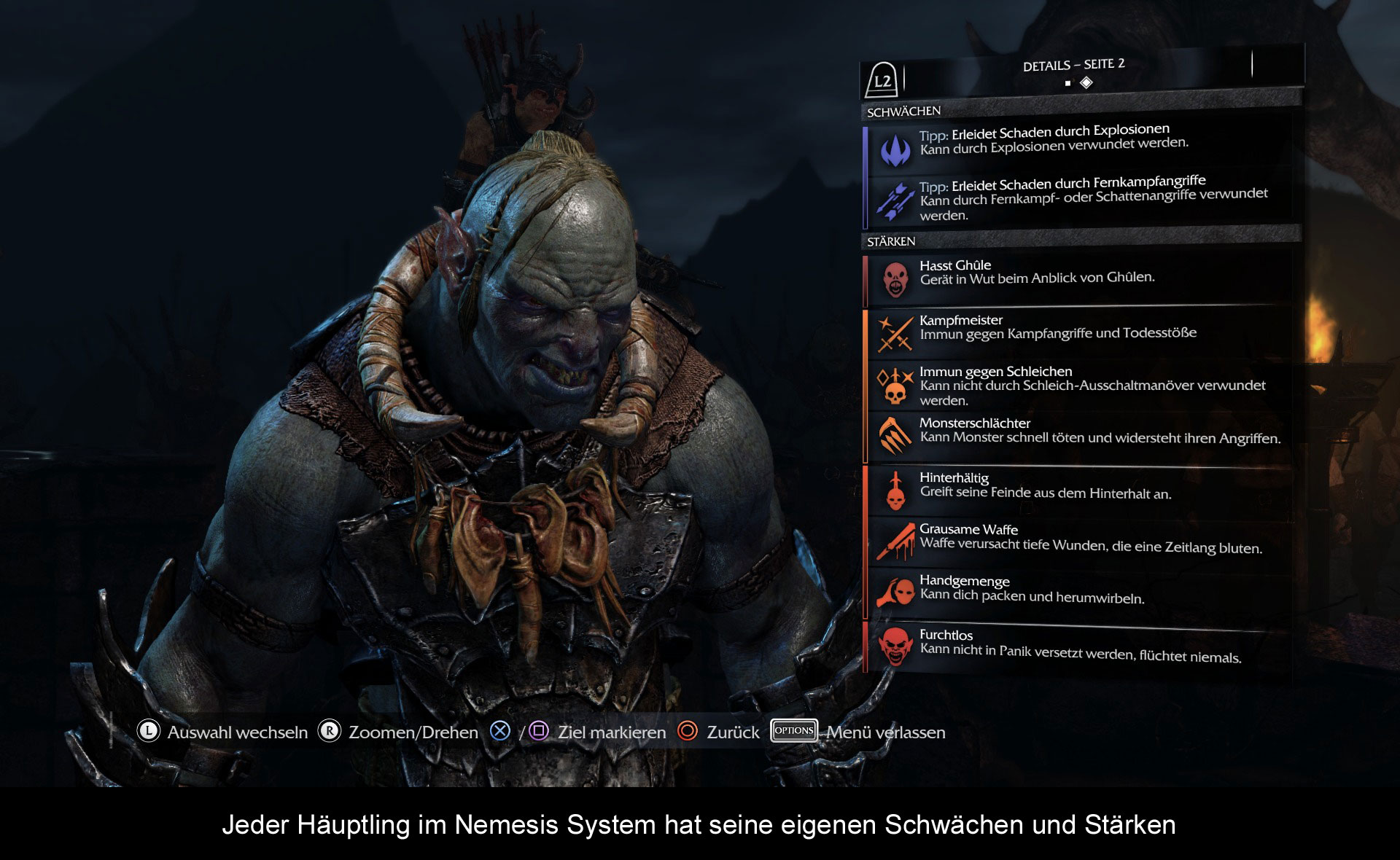 Mit der „Batman“ Reihe hat Warner Bros. eines der besten Kampfsysteme für Spiele in ihrem Haus erfunden und sie machen davon hier auch Gebrauch. Arkham Veteranen fühlen sich in Mittelerde sofort zu Hause, denn Talion steuert sich wie Batman. Auf Dreieck wird gekontert, mit Viereck geschlagen und ist das Combo Meter erstmal voll, darf eine Spezialattacke eingesetzt werden. Das Kampfsystem hat viele kleine Tricks, um es spaßig zu gestalten und es bleibt dennoch simpel und einfach. Abgerundet wird das System mit Runen, welche man durch besiegte Gegner bekommt und die eure Waffen zusätzlich aufwerten. So spaßig das Kampfsystem auch scheint, sollte das aber der letzte Ausweg sein. Gerade am Anfang ist Talion sehr schwach und wird man von Feinden eingekreist, findet man auch schnell den Tod. Sterben ist ein essentieller Bestandteil des Spieles, aber dazu nachher mehr. Einzig die Gegnertypen lassen zu wünschen übrig, denn diese unterteilen sich in gerade einmal in sechs Typen. Es ist zudem ratsam, bevor man sich in ein Getümmel stürzt, die Umgebung zu Erkunden. Talion verfügt über die Möglichkeit Gegner durch Wände zu sehen und nahezu jede Oberfläche zu besteigen. Ganz in „Assassin’s Creed“ Manier erklimmt man Türme und schaltet lautlos mit Bogen und Dolch seine Gegner aus. Im Gegensatz zu Ubisofts Spielen leidet Mordor etwas an der ungenauen Steuerung. Das Erklimmen der Mauern erfolgt zu sehr magnetisch. Auch Schleichtötungen können durch das ungenaue Zielen schon mal daneben gehen und dann wird man schnell entdeckt. Ob das geschehen ist, verrät ein kleines Dreieck über den Kopf des Gegners. Bei Gelb sind die Orks wachsam und Erkunden die Umgebung. Bei Rot ist es zu spät und eine wilde Meute ist auf euren Fersen. Um dies zu verhindern, wurden zahlreiche kleine Fallen eingebaut. In Festungen findet man immer wieder Fliegenneste und Käfige mit wilden Bestien. Setzt man diese geschickt als Ablenkung ein, kann man schnell ein ganzes Lager auslöschen ohne gesehen zu werden. Die Eigenheiten der Umgebung sollte man schnell verstehen und sich zu nütze machen. Auch den Entwicklern war das sehr wichtig, vielleicht eine Spur zu wichtig. Viele der Storymissionen befassen sich mit diesen Konzepten und machen von allen Möglichkeiten guten Gebrauch. Erst bei späteren Aufträgen ist man auf sich alleine gestellt und bekommt keine Tipps mehr, wie man seine Aufgaben bewältigen kann. Ist man an diesem Punkt angekommen, kann man sich sicher sein, dass man das mächtigste Wesen in Mordor ist. Gegner erzählen von euren Taten und die mächtigsten Monster fallen schnell Talions Klinge zu Opfer. Grund dafür ist das gut strukturiere Skill-System, das jeden investierten Punkt die Fähigkeiten erweitern und Talion immer mächtiger werden lässt. Durch gelungene Aktion wird man mit Erfahrungspunkten belohnt, welche Skills freischalten. Die Währung Mirian kann dagegen in Gesundheit, Pfeilkapazität und Runen investiert werden. Zudem sind Machtpunkte sie für Missionen und Skillpunkte nötig und essential für das Nemesis System.