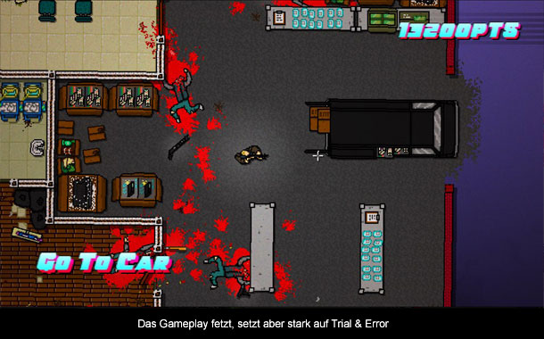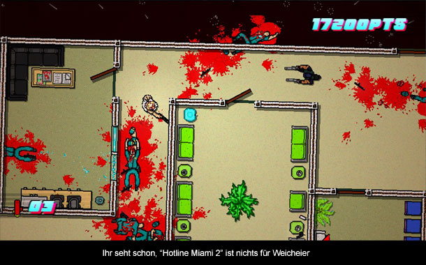 Letztlich ist die Geschichte aber nur nettes Beiwerk und man konzentriert sich auf das Gameplay, was quasi 1:1 aus dem Vorgänger übernommen wurde. Wieder wird man einfach in ein Gebäude geworfen und muss dort Etage für Etage die Gegner erledigen. Dazu stehen einen unterschiedliche Möglichkeiten zur Verfügung. Beispielsweise kann man den Gegner mit der Hand niederschlagen und ihn dann am Boden den Kopf einschlagen oder gleich eine Waffe nehmen, wie beispielsweise einen Baseballschläger. Schusswaffen gibt es auch und die sind am effektivsten, locken aber natürlich andere Gegner durch die Geräusche an. Problematisch ist auch, dass die Gegner die gleichen Möglichkeiten haben, um euch das Leben auszuhauchen und das passiert schneller als einem lieb ist. Ein Treffer und man segnet das zeitliche. Bei Schusswaffen weiß man zum Teil gar nicht, was einen gerade getroffen hat, weil sie auf die Entfernung natürlich gefährlicher sind. Deshalb ist es wichtig sich einen guten Überblick über die Situation zu verschaffen und dann mit einem Plan vorzugehen. Letztlich artet es aber auch in etwas Trial & Error aus, denn nur durch schnelle Kills kann man seine Combo oben halten. Das verleitet dann aber auch zu etwas Leichtsinn. Etwas Abwechslung ins Gameplay bringen die verschiedenen Masken. Denn je nach Maske hat man andere Fähigkeiten. Beispielsweise kann man mit der Gänsemaske sich unter Schüssen ranrollen und die Bärenmaske gibt einem gleich zu Beginn zwei Maschinengewehre. Je nach Spielstil kann sich eine andere Maske natürlich anbieten und diese schaltet man nacheinander frei. Wie man aber sieht, gibt es im Gameplay kaum Neuerungen. Es ist „Hotline Miami“ durch und durch. Dafür ist es aber eine ganze Ecke schwieriger, was vor allem an mehr Gegnern mit Schusswaffen liegt. Leider wird das an sich gute Gameplay von einigen nervigen Bugs manchmal zur Tortur. Nahezu jedes Kapitel hatte mit irgendwelchen Fehlern zu kämpfen. Mal werden entscheidende Items in eine Wand gedroppt, dann verschwinden Gegner außerhalb des Sichtfeldes, dann funktioniert das Fadenkreuz kaum und Abstürze gibt es auch. Auch wenn es sich hier um einen Indie-Titel mit wenig Budget handelt, sind das ein paar Fehler zu viel und die Häufigkeit der Fehler nervt auch. Zwar lassen sich die meisten Fehler mit einem Levelneustart beheben, aber das kann auch nicht die Lösung sei.