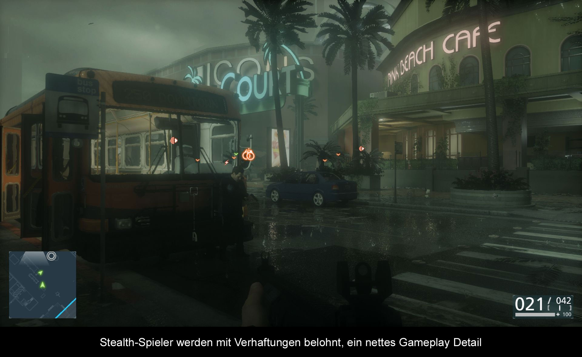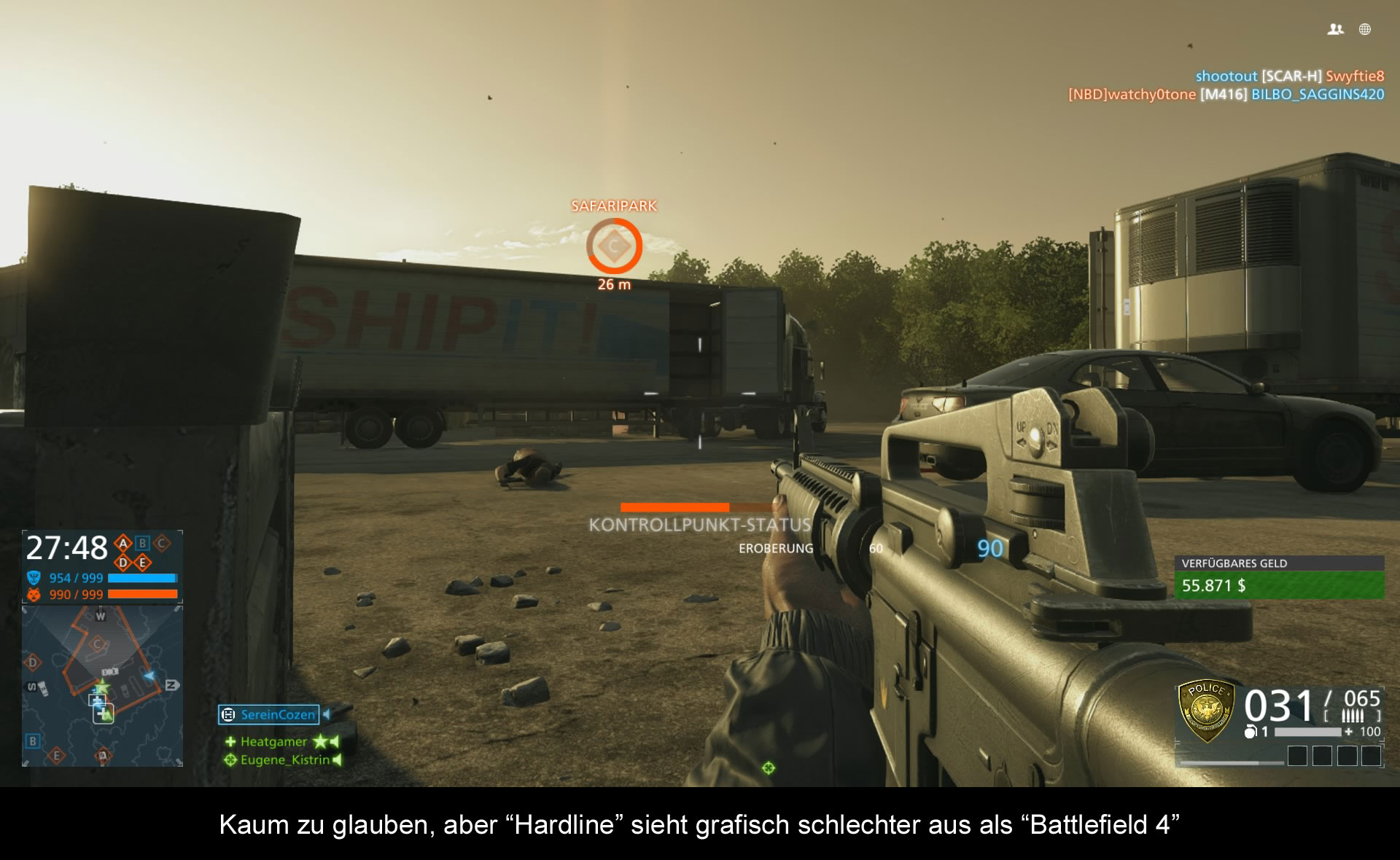 Wer ein „Battlefield“ Spiel kauft, weiß im Vorfeld meistens, was ihn erwartet: Non Stop Shooter Action! Umso überraschender ist die Tatsache, dass „Hardline“ einen interessanten Twist bietet. Während man bei der Geschichte an Innovationen gespart hat, überrascht das Gameplay mit einigen interessanten neuen Elementen. Um es kurz zu fassen: „Battlefield: Hardline“ kann auch als Schleich-Spiel durchgehen. Oftmals geht es darum die Levels so leise, wie möglich zu durchforsten. Dies geschieht indem man in gebückter Position durch die einzelnen Areale schleicht. Hat man einen Gegner vor sich, kann man ihn mit dem Aufzeigen der Dienstmarke dazu bewegen die Waffe niederzulegen. Bis zu 3 Personen können damit unter Kontrolle gehalten werden. Anschließend sollte man den Verbrechern möglichst schnell die Handschellen anlegen, da sie nach einer gewissen Zeit aufmüpfig und schießwütig werden. Ist dieser Moment eingetroffen verwandelt sich „Hardline“ in ein traditionelles „Battlefield“ Spiel, wo jeder auf euch los schießt. Serientypisch sollte man in diesem Fall auf Direktkonfrontation verzichten, und stattdessen lieber aus der Deckung schießen. Abgerundet wird dieses Spektakel mit einem simplen Level-Up System, welches zur Freischaltung von zusätzlichen Waffen dient. Die meisten Punkte lassen sich durch das geräuschlose Ausschalten von Standardgegner erspielen. Darüber hinaus gibt es in jedem Level spezielle Extra-Gangster, die bei einer Festnahme ebenfalls euer Punktekonto aufstocken. Diese laufen jedoch nicht klar erkennbar durch die Gegend, sondern müssen erst mit dem Handy aufgespürt werden. Weiterhin kann die digitale Schnüffelnase auch dafür benutzt werden, um Beweismittel aufzuspüren. Diese helfen unter anderem dabei ein wenig mehr über die Hintergründe der Geschichte zu erfahren. Alles in allem hat mir der neue Stealth-Aspekt sehr gefallen. Dennoch haben wir es hier mit keinem Meilenstein der Videospielgeschichte zu tun. Die Ausführung ist relativ simpel ausgefallen. So geht es meistens nur darum nicht ins Sichtfeld der Bösewichte zu geraten. Abstrus wird’s jedoch, wenn man merkt dass diese Regeln aber nicht für den eigenen Partner gelten. Der kann zum Beispiel problemlos durch die Gegend laufen, ohne Aufsehen zu erregen – selbst, wenn er direkt in das Sichtwelt der Gangster läuft. Dieser Bug kommt leider relativ häufig vor, was dem neuen Stealth-Aspekt ein wenig die Glaubwürdigkeit nimmt. Und auch die endlose Anzahl an Patronenhülsen, die zur Ablenkung der Gegner dienen, erinnert einem immer wieder daran, dass „Hardline“ halt nur ein Videospiel ist. Realismus sucht man hier vergebens. Verstärkt wird dieser Gedanke durch die Vielzahl an übertriebenen Setpieces. Ich kenne mich jetzt nicht allzu gut mit dem Polizeitalltag aus, aber ich denke, dass Alligatorenkämpfe und Panzerfahrten nur selten zum Standardprogramm gehören. Stattdessen kam ich während des Spielens nicht von dem Gedanken ab, dass man bei EA lediglich eine simple Checkliste mit „Battlefield“-typischen Elementen durchgegangen ist. Panzer? Check! Sprung aus einem Hochhaus? Check! Zeitlupen Shootouts? Check! Die Liste könnte nur so weitergehen. Ich persönlich finde zwar nicht, dass sich „Hardline“, wie eine simple „Battlefield“ Mod spielt, aber dennoch wirkt die Gesamtkonstellation sehr berechnend. Immerhin haben sich die Jungs von EA dafür entschieden auf sozialkritische Elemente zu verzichten, da diese wohl auch trotz der letzten Ereignisse in den Vereinigten Staaten nur bedingt in das Konzept gepasst hätten. „Hardline“ nimmt sich nur selten ernst. Deswegen ist es meiner Meinung nach okay, dass man diese kontroversen Elemente außen vor gelassen hat.