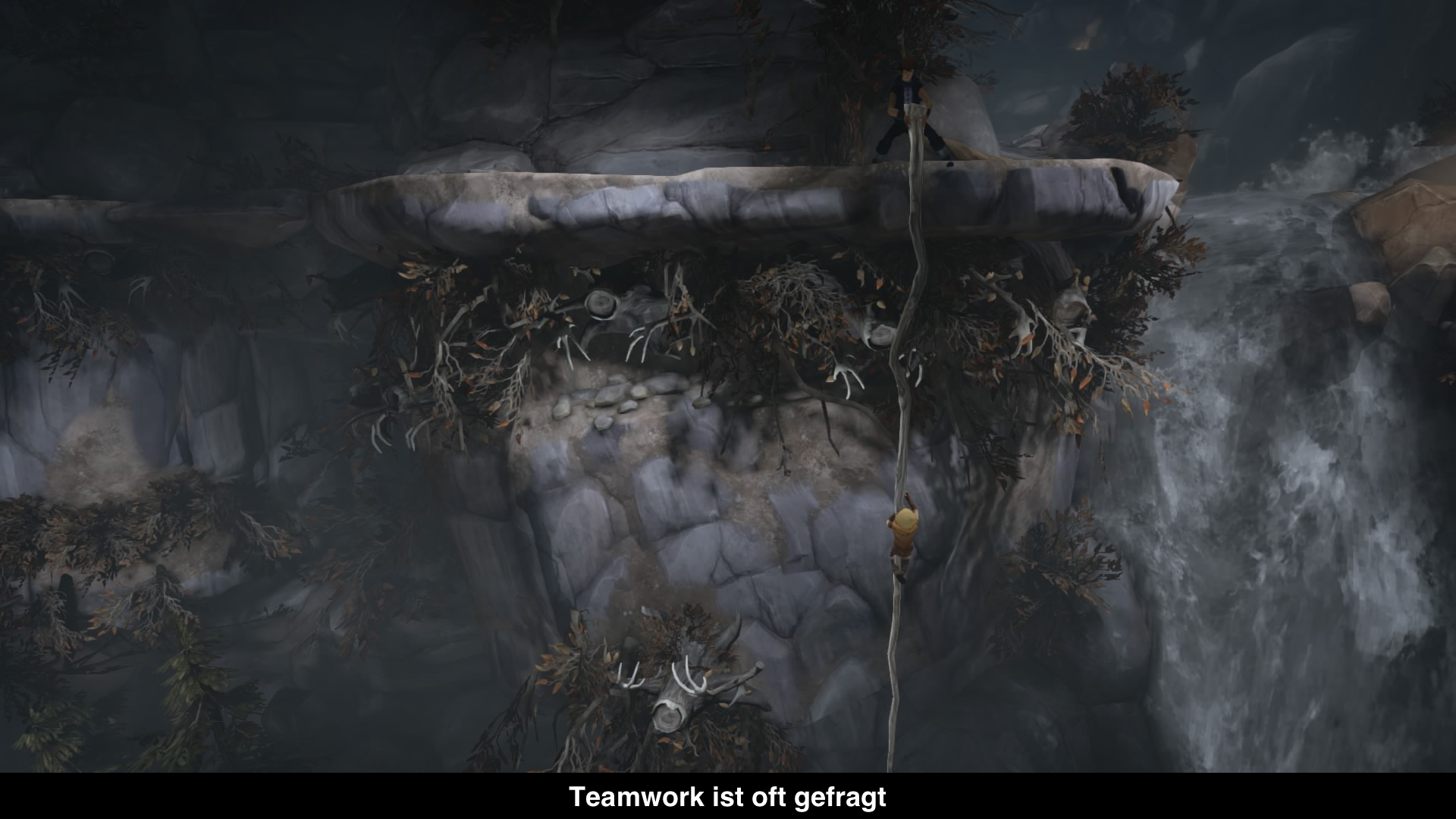Spielerisch verfolgt Brothers: A Tale of Two Sons ein sehr interessantes Konzept, denn man steuert beide Brüder gleichzeitig. Pro Bruder nutzt man einen der Analogstocks und die passende L2- bzw. R2-Taste, um mit der Umwelt zu interagieren. Anfangs ist das Konzept noch sehr gewöhnungsbedürftig, aber mit der Zeit gewöhnt man sich doch daran. Wirklich intuitiv wird es aber nie, obwohl man ständig Rätsel und Aufgaben mit den beiden zu lösen hat. Mal muss man mit einem der Brüder einen Troll ablenken oder aber den Weg für den anderen frei machen. Wer möchte kann auch ganz viel mit der Umwelt interagieren und je nachdem mit welchem Bruder man es macht, ändert sich auch die Reaktion. Während der ältere Bruder meist seriös bleibt und Dorfbewohnern hilft oder sie nach dem Weg fragt, ist der jüngere Bruder für jeden Spaß zu haben. Leider benötigt keines der Rätsel wirklich etwas Grips, da die Lösung immer auf der Hand liegt und man so quasi kaum scheitern kann. Irgendwann wiederholen sich die Aufgaben auch immer mehr.