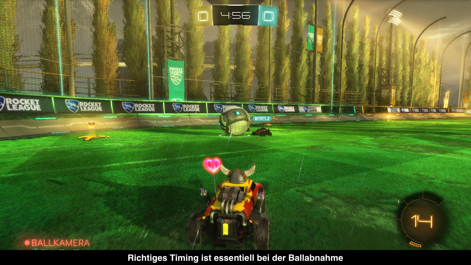 Gameplaytechnisch ist Rocket League gar nicht so leicht wie anfangs erwartet. Die Steuerung ist relativ schnell verinnerlicht, da nicht mal alle Tasten des Gamepads benötigt werden. Doch da das ganze Spiel mit Einsatz von Nitro sehr schnell abläuft und der Ball größer als die Autos ist, verliert man schnell die Übersicht. Die Kamera kann auf den Ball festgesetzt oder frei selbst gesteuert werden, dadurch kann man wieder etwas an Übersicht gewinnen. Die Racer fahren in den Ball und dieser fliegt durch die Luft. Mithilfe von Nitro holt man ihn ein und versucht, ihn irgendwie zu kontrollieren und ins Tor zu drücken. Das klingt chaotisch, ist es auch meistens. Spaß macht es dennoch sehr. Je mehr Freunde mitspielen, desto besser. Wenn einem eine „Passstafette“ oder ein „Fallrückzieher“ (ja, das Auto kann springen) gelingt, ist das herrlich anzusehen, denn es wird direkt im Replay angezeigt.
