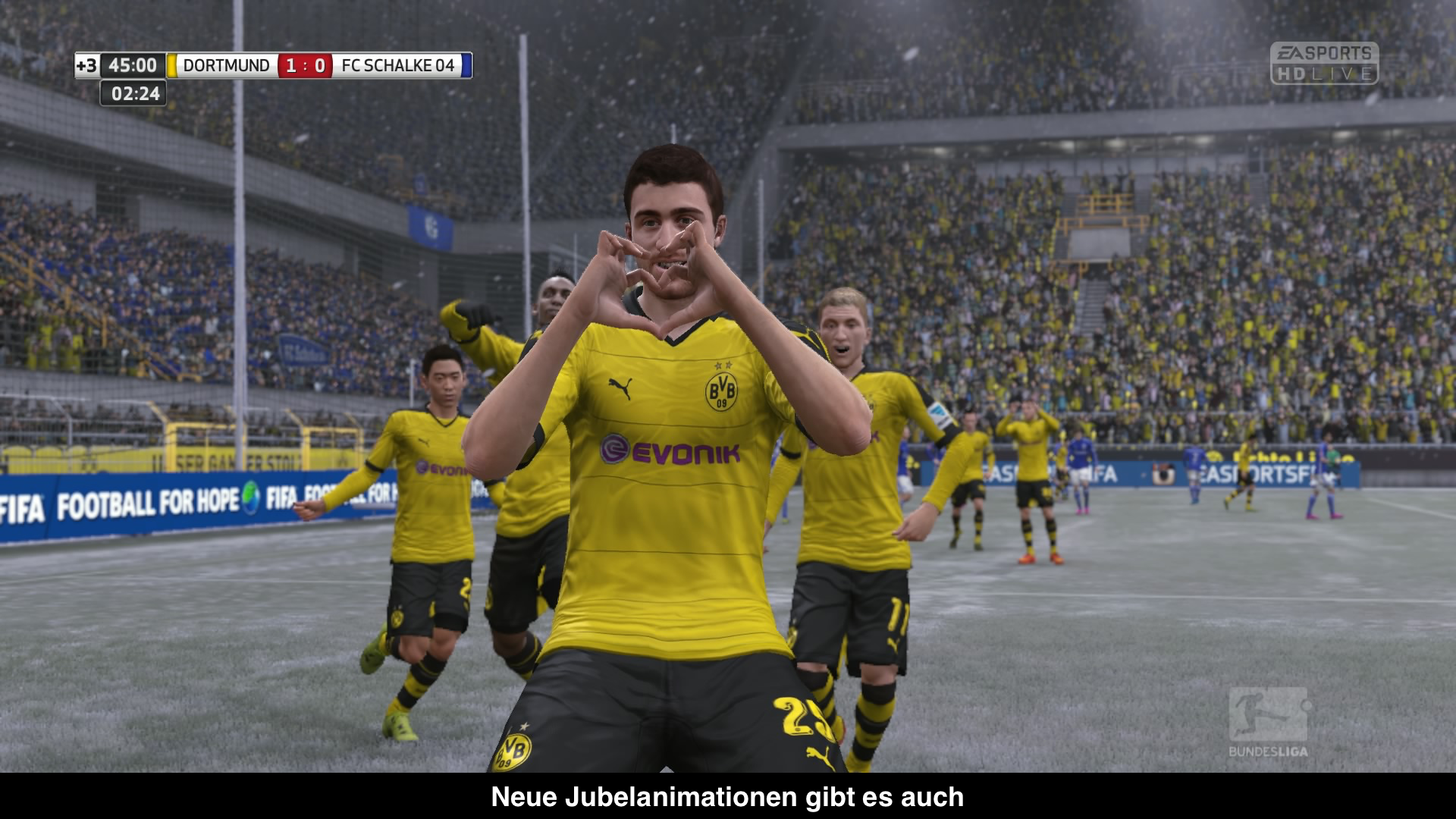 Deutlich besser gelungen ist die Aufmachung und Atmosphäre des Spiels. Wie nicht anders gewohnt ist extrem viel los auf dem Platz. Es gibt individuelle Jubel, 3D-Fans, Choreos und neuerdings auch eine lizenzierte Bundesliga. Das bedeutet der Spielstand oder die Startaufstellung wird genau so wie im PayTV angezeigt. Selbst die Halbzeitmusik wurde übernommen! Natürlich gibt es aber auch die Torlinientechnik oder das Freistoßspray. Weitere Änderungen finden sich im Wetter, wovon es nun mehr Einstellungsmöglichkeiten gibt. Statt Sonne, Schnee oder Regen gibt es jetzt auch noch Nebel oder Schneegestöber, wo sichtbar ist, wie mit der Zeit immer mehr Schnee auf dem Platz liegt. Leider sind die grafischen Effekte mehr als nur ausbaubar und dynamisches Wetter wäre wünschenswert. Ein absolutes Unding sind aber die Ladezeiten des Spiels in den Menüs. Nahezu jeder Klick in den Menüs löst eine mehrere Sekunden lange Ladezeit aus, die auf Dauer wirklich nervig sind.