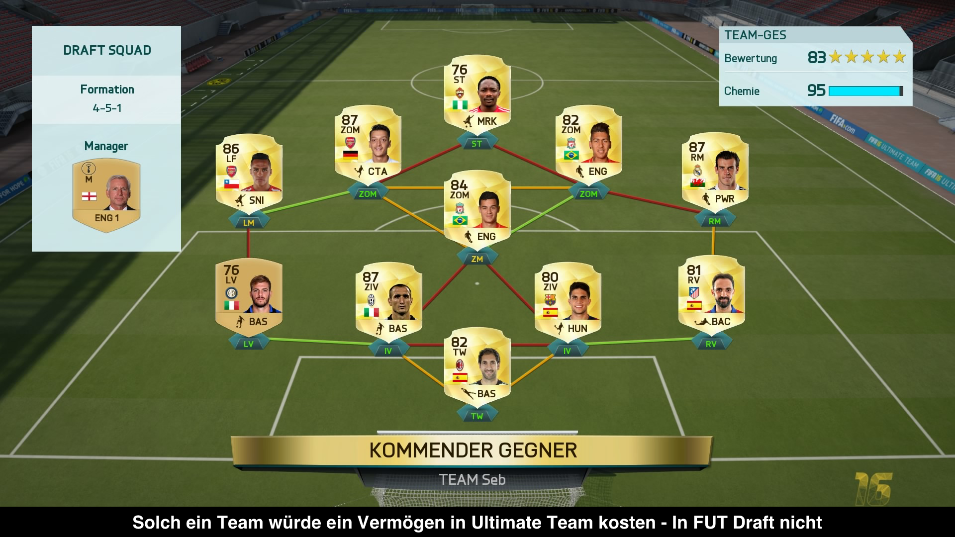 Neu hinzugekommen ist dafür der FUT Draft Modus. Hier spielt der Zufallsaspekt eine zentrale Rolle. Denn ihr könnt euch eine aus fünf zufällig angebotenen Aufstellungen aussuchen und füllt dann dementsprechend die jeweiligen Positionen auch aus. Immer bekommt ihr fünf zufällig zugeloste Spieler und müsst einen auswählen. Dabei könnt ihr euch entscheiden, ob ihr eher auf eine tolle Chemie im Team achtet oder auf eine hohe individuelle Klasse. Insgesamt bekommt man hier viel einfacher viel bessere Spieler. Ein Messi, Ronaldo oder Reus ist im normalen Ultimate Team kaum bezahlbar, hier bekommt man ihn aber öfters einfach zugelost. Mit der so erkorenen Mannschaft muss man dann vier Spiele bestreiten und je mehr Spiele man gewinnt, desto mehr kann man am Ende gewinnen. Sobald man aber einmal verliert, ist der Modus vorbei. Das Problem an der Sache ist, dass man zur Teilnahme entweder einen Draft Token benötigt oder aber 15.000 Coins. 15.000 Coins sind aber nicht mal eben gesammelt. Man wird ca. 30 Spiele benötigen, um die Coins nur durch die Belohnungen zu bekommen und dabei fehlen noch die Kosten für benötigte Vertragskarten etc. Man sammelt also mühselig seine Coins, setzt sie ein und verliert im schlimmsten Fall direkt das erste Spiel. Danach bekommt man zwar mindestens den Einsatz in Form von Sets wieder, die darin enthaltenen Karten können den Einsatz aber meist nicht Ansatzweise ersetzen. Unterm Strich ist es dann also ein ziemliches Verlustgeschäft und der Zufallsaspekt kann dann schon mal klare Nachteile enthalten. Wenn man selber gerade mal eine Mannschaftsstärke von 78 zusammenbekommt und der Gegner mit Messi und Ronaldo im Sturm aufläuft, kann es schnell frustig werden.