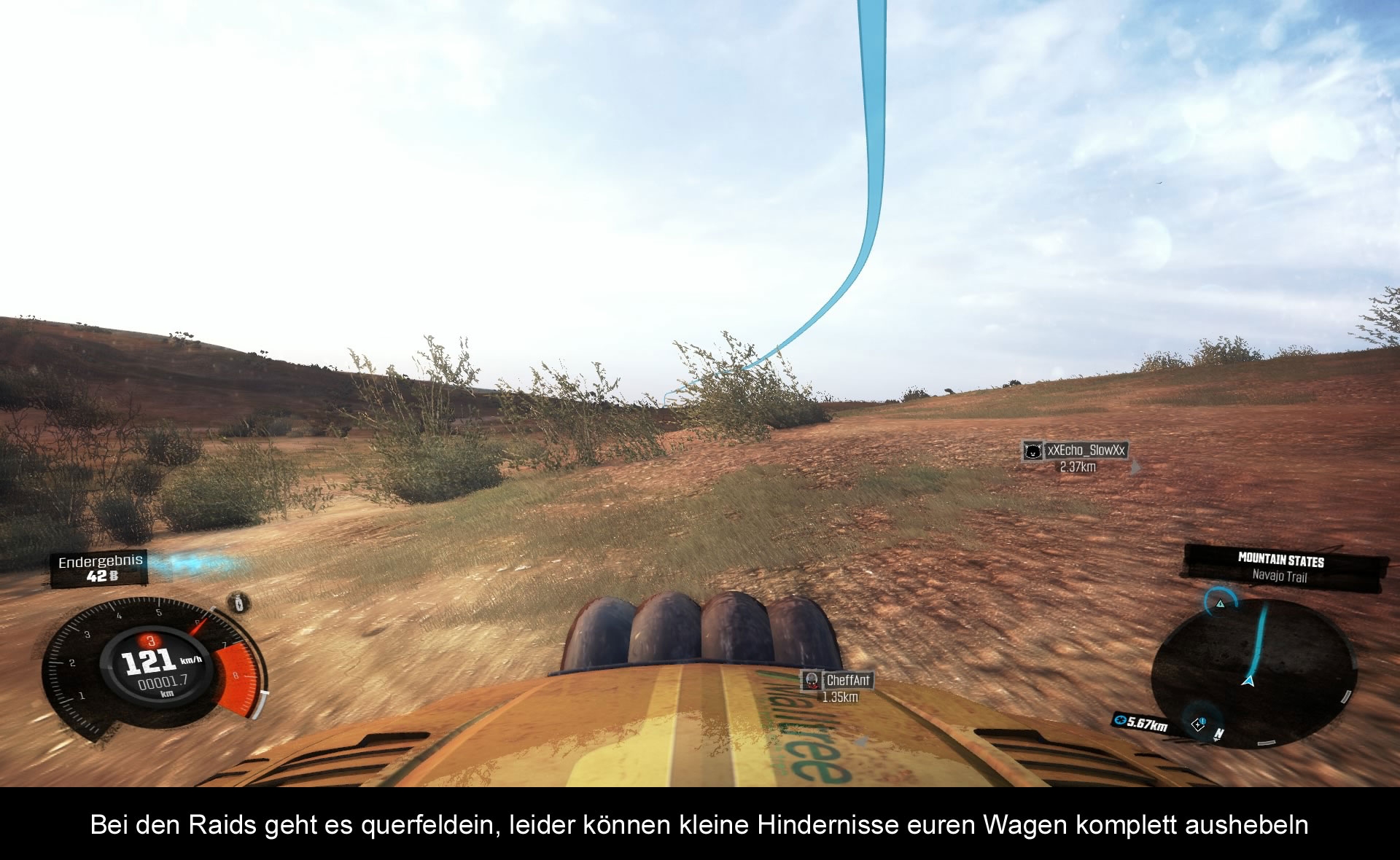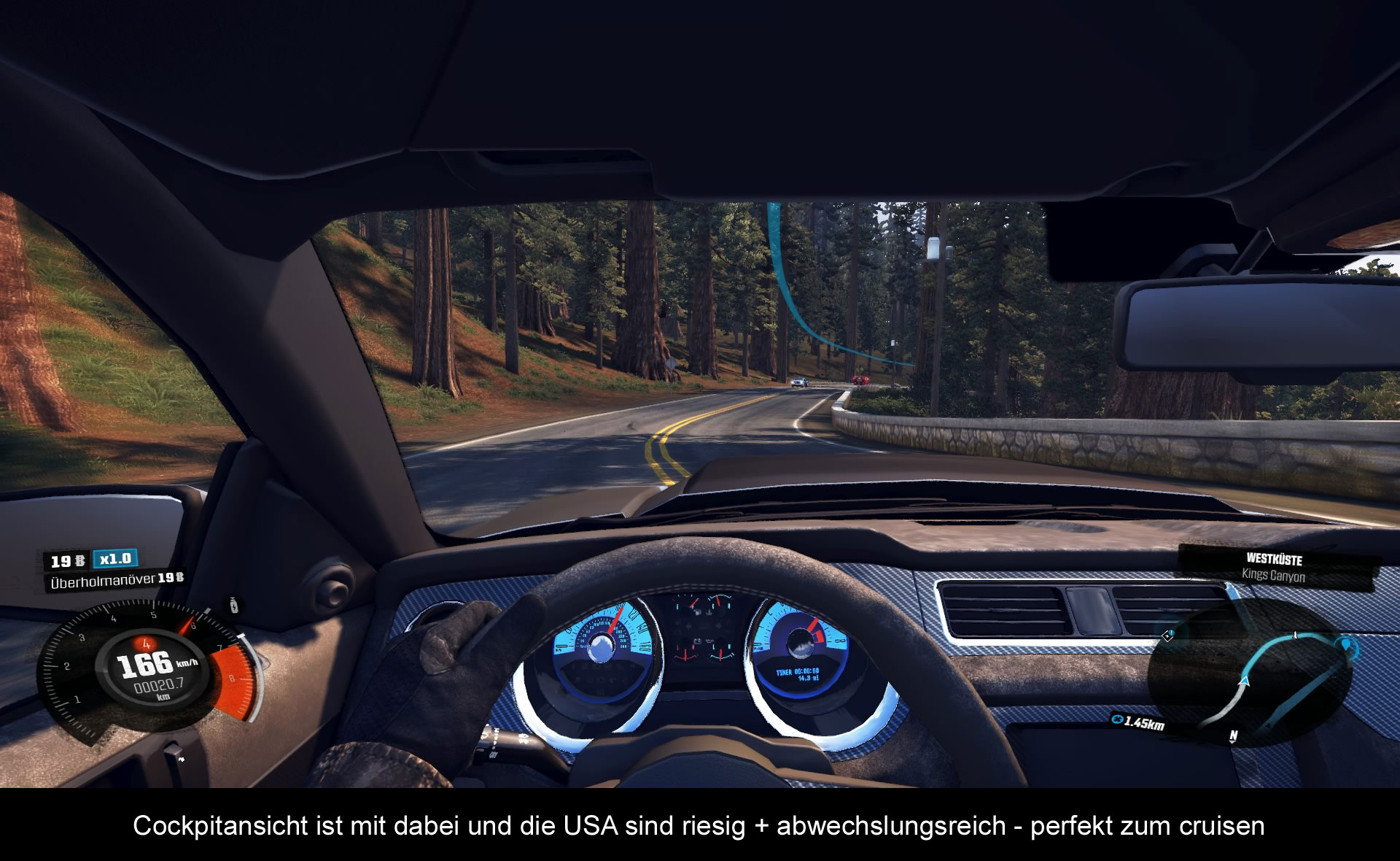Die Grafik in „The Crew“ gewinnt keinen Blumentopf. Zwar gibt es durchaus hübsche Plätze und allgemein wurde die Szenerie des nordamerikanischen Kontinents sehr gut eingefangen und es wird dementsprechend viel Abwechslung geboten, aber zum einen ist die Framerate nicht stabil und zum anderen trüben Tearing / Ruckler das Bild. Auch kann es hier und da mächtig Flimmern, vor allem in Großstädten und an Kreuzungen. Doch am Meisten hat mich das HUD gestört, das zwar aufgeräumt ist, aber warum auch immer pulsiert und dadurch extrem auf die Augen geht. Positive muss man dafür erwähnen, dass man kinderleicht über die Karte in bereits entdeckte Regionen reisen kann und das fast komplett ohne Ladezeiten. Zudem verfügen die Fahrzeuge alle über ein eigenes Cockpit, sind liebevoll modelliert und dank optischen Tunings auch wunderbar personalisierbar. Schade nur, dass nicht jedes Fahrzeug für jede Klasse geeignet ist und man bei einigen Sachen doch nur auf eine recht begrenzte Auswahl an Optionen zugreifen darf. Bei all der Meckerei muss ich jedoch auch gestehen, dass es ein großartiges Gefühl ist, mit einem alten Ford Mustang durch die Gegend zu heizen oder aber mit einem Rennwagen die vereisten Serpentinen in den Bergen lang zu schlittern. Aber damit wird wahrscheinlich nicht jeder seinen Spaß haben. Die Server, das Spiel verlangt ja nach einer ständigen Onlineverbindung, laufen übrigens ziemlich stabil. Hänger oder Abstürze, mit denen ich damals noch in der Beta zu kämpfen hatte, gibt es keine. Nur wenn die Ubisoft Server – oder bewahre, das PSN-Network offline sind, kann man mit dem Spiel wenig anfangen. Der extra zu kaufende Season Pass bietet übrigens nur neue Autos und ist für meinen Geschmack zu teuer und umfangsarm. Braucht man also nicht. Neue Events werden in gewissen Abständen hinzugefügt und nimmt man an Fraktionsrennen teil, bekommt man auch täglich Geld überwiesen…