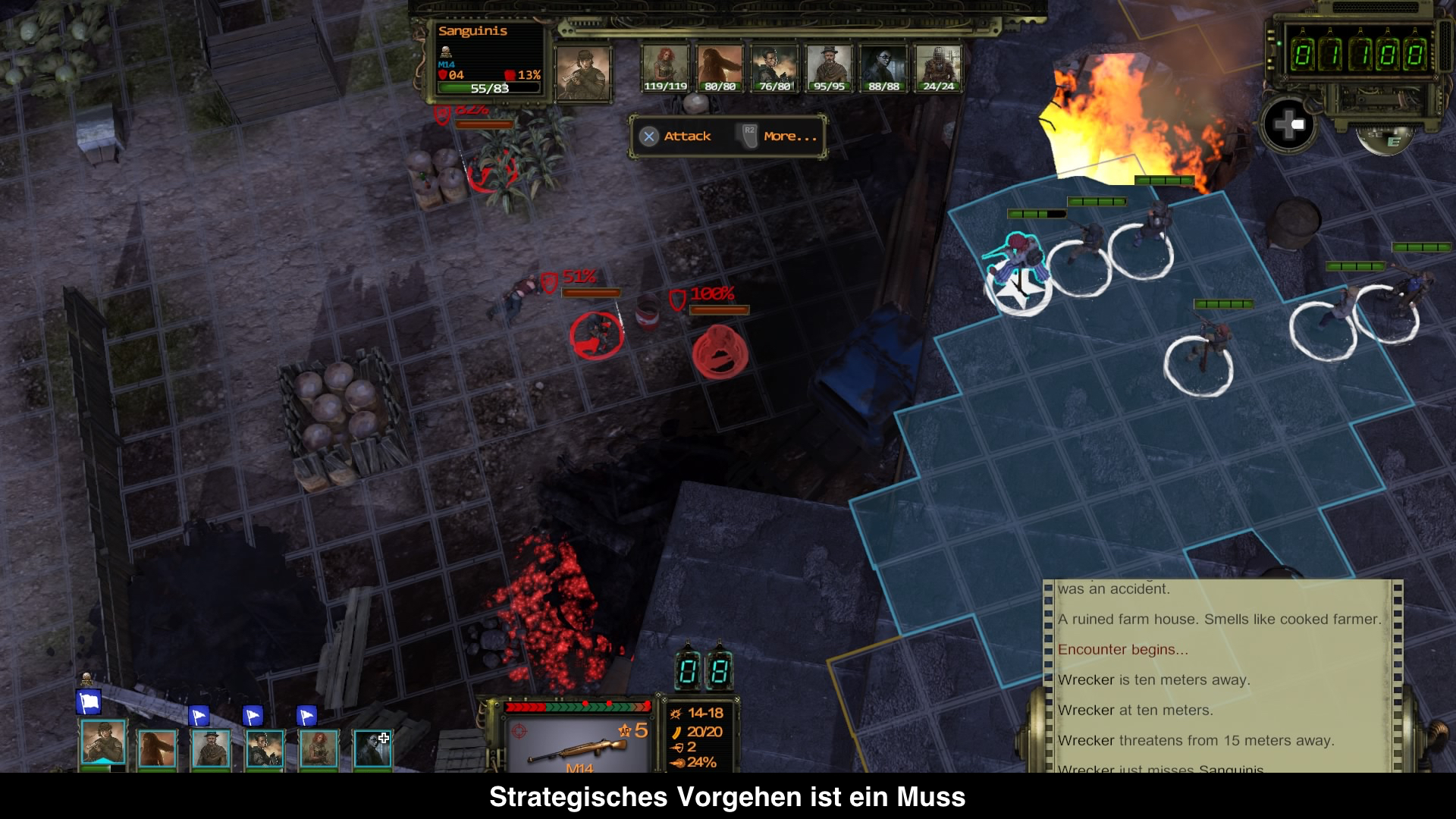 Ein weiteres wichtiges Detail sind die Feuerlinien. Meine Jungs sind clever genug, an den eigenen Kameraden vorbeizuschießen, wenn sie vor ihnen stehen. Geht allerdings ein Schuss komplett daneben, kann es sein, dass es die eigenen Leute erwischt, wenn sie daneben oder dahinter stehen. Das gilt natürlich ebenso für Deckungen und andere Gegner. So kann auch ein verfehlter Schuss noch nützlich sein. Vor allem Maschinenpistolen und andere Waffen mit Burst Fire oder Vollautomatik sind bei dicht stehenden Gegnergruppen nützlich.