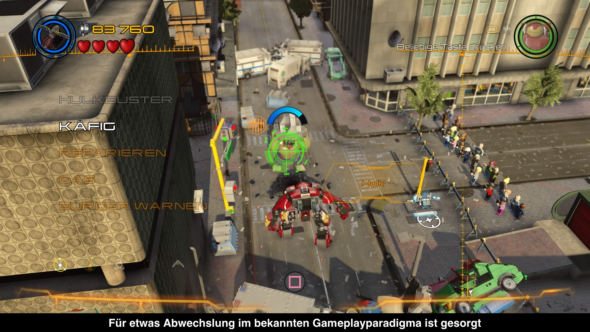 Ähnlich wie bei „LEGO Batman 3“ gibt es wieder zahlreiche kleine Hub-Welten. Beim Übergang zur nächsten Handlungsmission kämpft man sich so durch S.H.I.E.L.D. Basis, Struckers Labor oder auch die Barton Farm. Hier löst man kleinere Aufgaben, um die Handlung voran zu treiben. Hat man alle Missionen erledigt, kann man diese Welten nach Belieben erkunden, wo wiederum neue Charaktere und Aufgaben warten. Diese Mini-Missionen reichen von „Bekämpfe X-Gegner“ bis hin zu „Suche Objekt X“. Auch in Land- und Luftrennen kann man sich beweisen. Die Ausnahme zu diesen kleinen Hub-Welten ist Manhattan. Man hat die Insel aus dem Vorgänger 1:1 übernommen. Nun ja nicht ganz dieselbe Insel, feinsäuberlich hat man alle Anspielungen an X-Men und Spiderman entfernt. Insgesamt 120 goldene Steine und über 40 Charaktere findet man hier zum Erspielen. Eine Mamutaufgabe, die einiges an Zeit erfordert, zumindest für den Spieler. Die Entwickler haben den leichten Weg gewählt und viele Aufgaben aus dem Vorgänger einfach übernommen. Generell fehlt es dem Spiel an dem bekannten LEGO Esprit. Die spielbaren LEGO Figuren waren immer der Höhepunkt, besonders die Superhelden. Durch ihre einzigartigen Fähigkeiten und Persönlichkeiten machte es Spaß immer wieder Neue zu testen. Es steht das Filmuniversum im Vordergrund, was wiederum bedeutet, dass man mit Figuren wie Jane Foster oder diversen S.H.I.E.L.D. Agenten zu tun hat. Nicht gerade die spannendsten spielbaren Charaktere. Bei den bekannten Comic Avengers hat man tief in die Trickkiste gegriffen und Bekannte, wie auch Unbekannte ausgegraben. Es ist interessant, Charaktere wie Cloud9 oder Gorilla Girl zu sehen, von denen man wohl noch niemals etwas gehört hat. Um fehlenden Avengers Charaktere aus den X-Men und Fantastischen 4 Comics zu ersetzten, bedient man sich reichlich bei der Hulk-, Captain America- und Iron-Man Familie. Dies trägt leider nicht zur Diversität des Spieles bei.