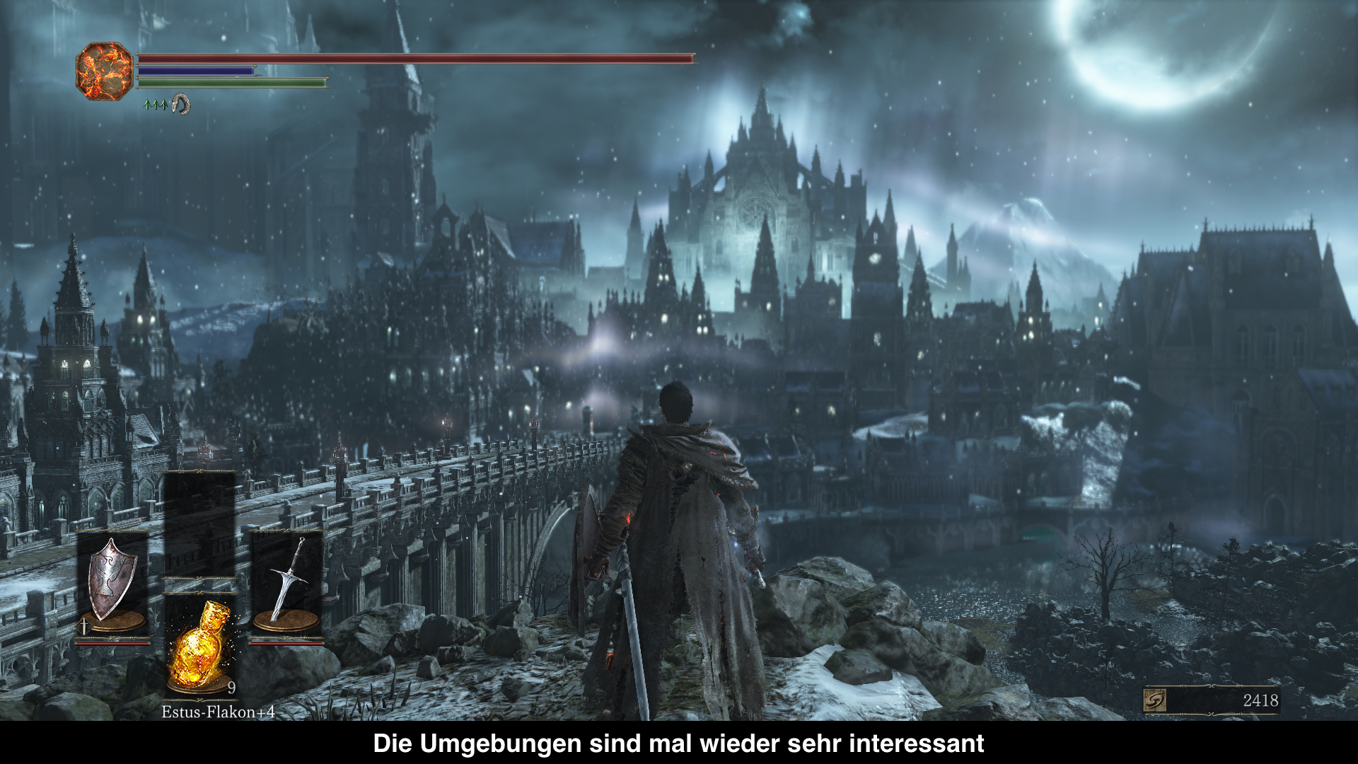 Lothric - Im Intro bekommen wir einen kurzen Eindruck von dem, was uns im Spiel später erwartet. Eine Welt in der so gut wie alles an Leben was es jemals gab ausgelöscht wurde und wir die vier Aschefürsten finden und besiegen sollen. Die Welt in der wir jede Menge Zeit verbingen werden, wirken größer als noch im Vorgänger, dafür gibt es nicht mehr so viele verschiedene Areale. Das soll an dieser Stelle kein Kritikpunkt sein, da sich hier die Verbindungen zwischen den Arealen sehr gut miteinander einfügen und es absolut stimmig ist. Nur sind die einzelnen Gebiete nicht mehr so Stark wie noch im ersten Teil. Da fehlt mir ein Stück vielfalt, was es einzigartiger macht oder aber ich habe mich an das Leveldesign gewöhnt und es haut mich nicht mehr komplett aus den Socken. Von der Stimmung her ist es fantasisch, die Atmosphäre ist kühl und in dunklen Ecken ist Vorsicht geboten, trotz der Fackel kann man schnell was übersehen. Das Team hat hier keine Experimente versucht und sich ganz klar für die sichere Bank entschieden und wenig neues probiert.