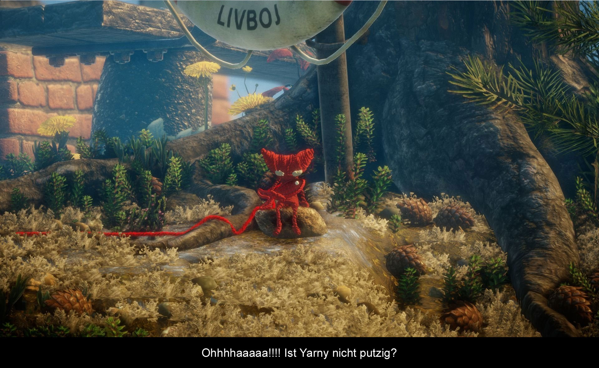 Das wichtigste Gameplay-Element ist Yarny selbst. Unser Garnmännchen besteht nämlich aus rotem Faden und der ist nicht endlich. Also muss Yarny immer wieder Checkpunkte erreichen, um sein Garn und damit seine Person (kurz bevor das Garn aufgebraucht ist, humpelt Yarny gebeugt und abgemagert umher) wiederherzustellen. Doch das Garn ist nicht nur Yarnys Lebensversicherung (Ha, das ist doch mal kein schlechter Kalauer), sondern wird auch gebraucht, um Hindernisse zu überwinden und Puzzles zu lösen. Dazu kann Yarny sein Garn an verschiedene Gegenstände knoten und diese bewegen oder Brücken bauen. Auch geklettert und abgeseilt wird mittels des Fadens. Gegner verdrischt man übrigens nicht – es lauern zwar zahlreiche Gefahren auf dem Weg, doch Yarny sollte sie alle umgehen. Ein wahrlich friedfertiges Spiel – Bravo! Die Steuerung fällt übrigens präzise und direkt aus, dadurch sind die Physik-Aufgaben auch alle machbar und gehen dem Spieler nicht gleich auf die Nerven. Überhaupt sorgt der Titel für eine innere Ruhe beim Spielen, was auch der tollen Grafik geschuldet ist und den passenden Sounds.