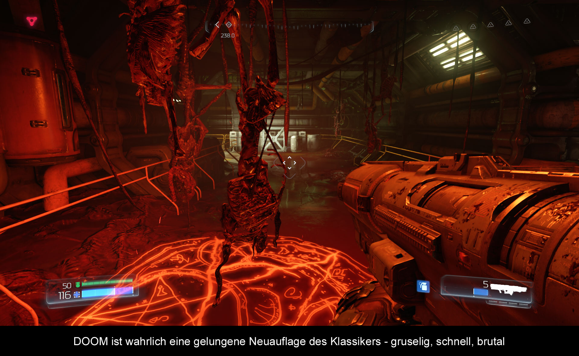 DOOM sieht fantastisch aus und es läuft in 1080p, also FullHD, und mit 60 Bildern pro Sekunde. Und das ist ein Highlight, denn aktuelle Shooter können meist nicht mit 60 Bildern pro Sekunde aufwarten oder sie machen Abstriche in der Grafik, doch das ist bei DOOM nicht der Fall. Es gibt wunderschöne Partikeleffekte und die Framerate geht nie spürbar runter. DOOM ist technisch wirklich eine Glanzleistung, welche auch im Multiplayer keine Probleme macht.