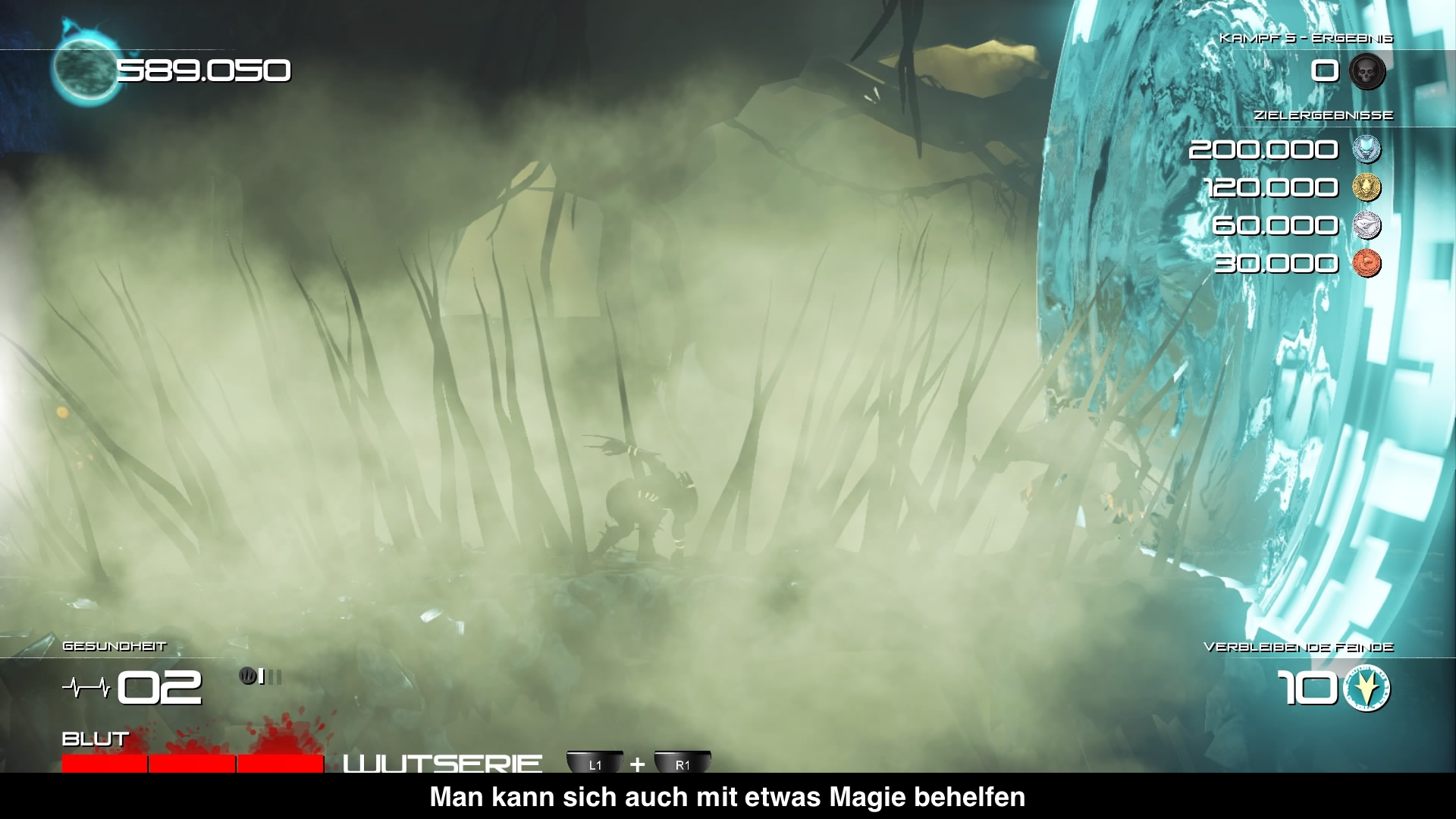 Die Geschichte von „Shadow of the Beast“ ist recht schnell erzählt. Ihr kontrolliert Aarbron, der als Kind von einer Alienrasse entführt wurde und nun als eine Art Kampfsklave gehalten wird. Auf einer Mission trefft ihr aber euren Vater, den ihr tötet und als Rache wollt ihr nun euren „Meister“ zur Strecke bringen. Gameplaymäßig präsentiert sich das Spiel als 2D-Sidescroller, in dem es hauptsächlich um Plattform-Passagen und Action geht. In den Plattform-Passagen dürft ihr kleinere Rätsel lösen, die wenig Hirnschmalz benötigen und ein paar Hüpfeinlagen meistern. Dazwischen müsst ihr immer wieder gegen mehrere Gegner kämpfen, die euch von rechts und links versuchen zu umzingeln. Eure Aufgabe ist es nun im richtigen Moment die Quadrat-Taste zu betätigen, um den Gegner zu töten. Um spätere Gegner zu besiegen, könnt ihr noch Blocken, Ausweichen und auch Gegner betäuben. So verkommt das Spiel aber fast schon zu einem Quicktime-Event, da ihr nur die richtige Tastenkombination herausfinden müsst. Je besser ihr das hinbekommt, umso mehr Punkte bekommt ihr, mit denen ihr euch mit euren Freunden messen könnt. Problem an der ganzen Sache ist, dass das ganze Gameplay eher träge und hakelig wirkt, was vor allem in den Hüpfeinlagen deutlich wird. So kommt selten Spielspaß auf und die Herausforderung motiviert auch nur bedingt. Wer übrigens möchte, kann auch das Amiga-Original komplett durchspielen.