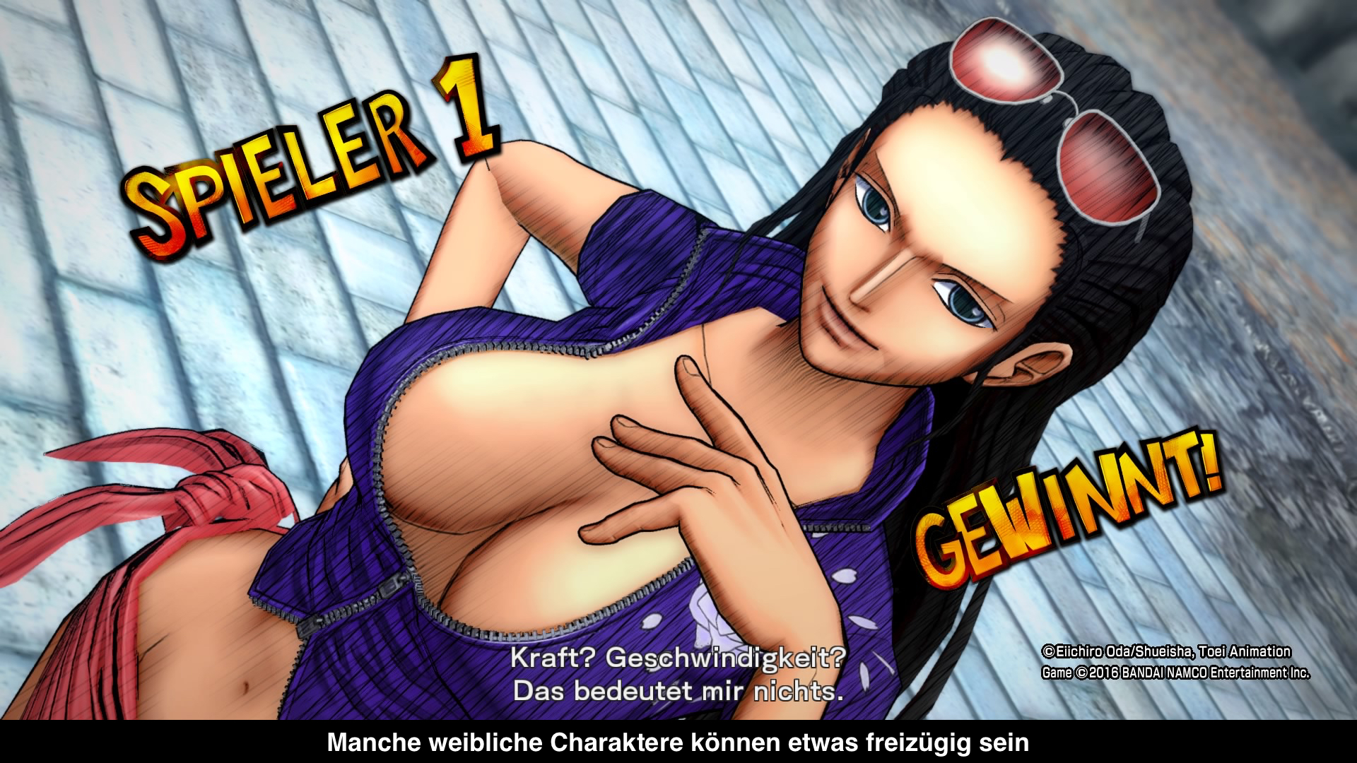 Die Kampfarenen stammen aus verschiedenen Handlungsschauplätzen, unteranderem von der Entscheidungsschlacht, der Fischmenschen Insel und Dressrosa. Jede weist eine zerstörbare Umgebung auf, hat aber keinen Einfluss auf den Kampf. Als optisches Zuckerl gibt es dafür eine eigene Animation, wenn man den Gegner mit einem mächtigen Schlag aus dem Ring befördert. Für die Musik gibt es wieder einen lizensierten Soundtrack aus dem Anime wie auch Eigenkompositionen. In allem sehr stimmig. Sprachausgabe ist in Japanisch, Texte wurden ins Deutsche Übersetzt. Das Minimum was man sich für eine Lokalisierung erwarten kann. Zumindest hat sich eine Person darum gekümmert, welche in der One Piece Welt bewandert ist.