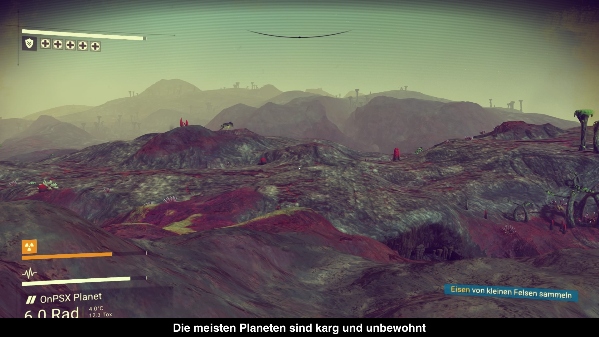 Die Musik des Spiels wird übrigens auch prozedural generiert, was aber eher schlecht als recht funktioniert. In gewissen Momenten kann sie zwar durchaus die Szenerie unterstützen, aber oftmals wirkt sie fehl am Platz. Manchmal ist man völlig alleine auf einem Planeten und dann setzt plötzlich völlig ohne Grund irgendein billiges Drumsolo ein, was überhaupt nicht passt oder man hört Laute von Tieren, obwohl weit und breit keine zu sehen sind.